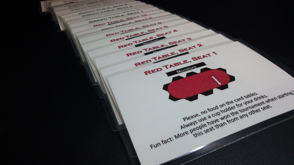All new, laminated seating cards. Easy to use map, so new players never have to ask "Which seat is seat 1?" and a different joke or trivia bit on each card.
