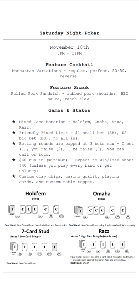 This past Saturday was our final event, the Zombie Poker Classic! We ended up with 19 players after 2 cancels.