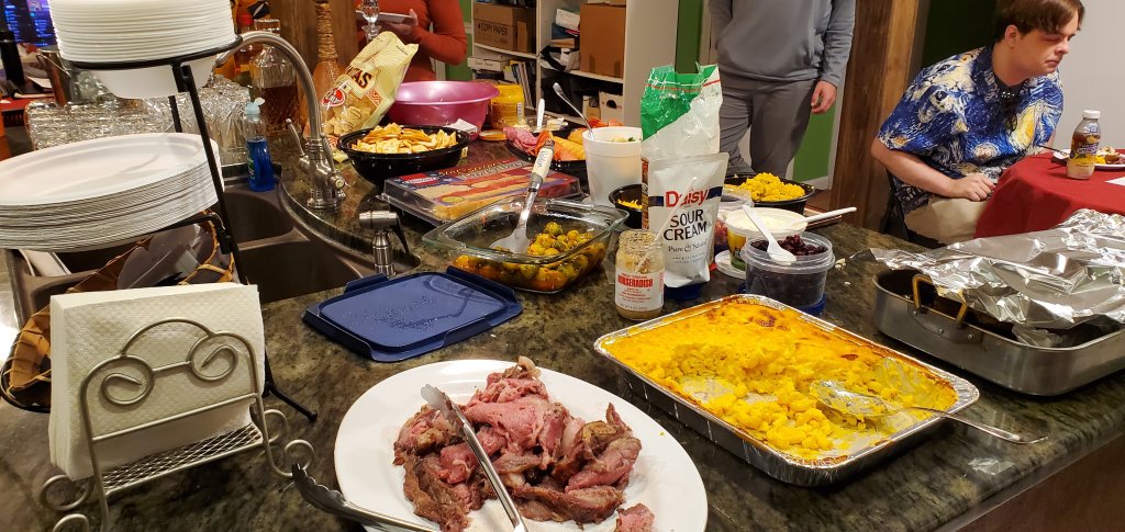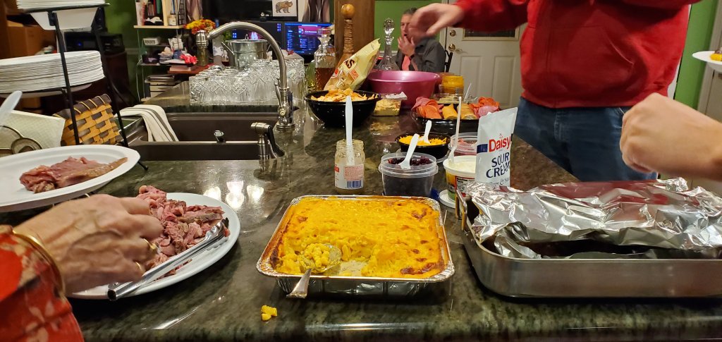 This was our 15th year and we maintain a tradition of prime rib main. This year, it was salted and put in the fridge for 2 days, then sous vide for 24 hours, and then followed with a 1-1/2 hour smoke. It was wonderful! Sides included: mac and cheese, baked potatoes (with all the fixings), spicy Brussel sprouts, corn pudding, corn bread, rice with broccoli, tamales, cheese/meat/crackers, chip and dip