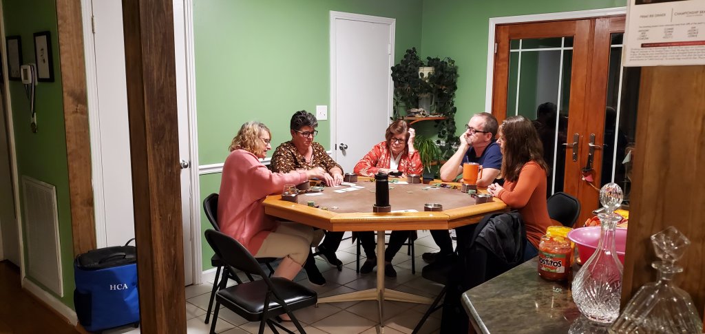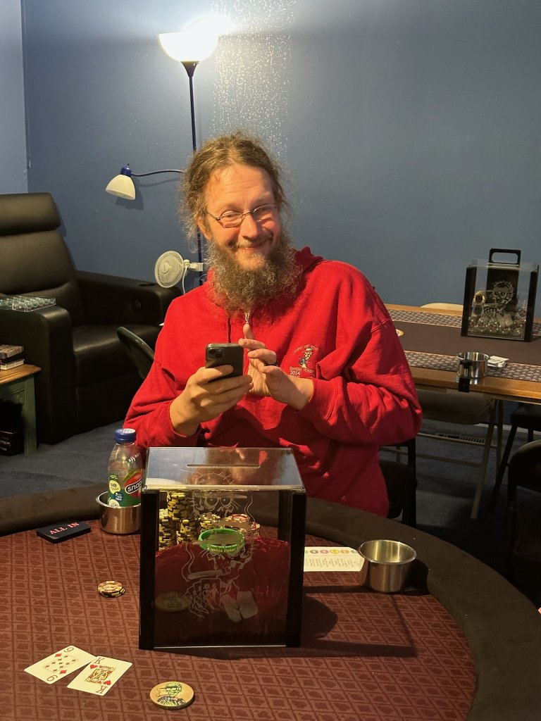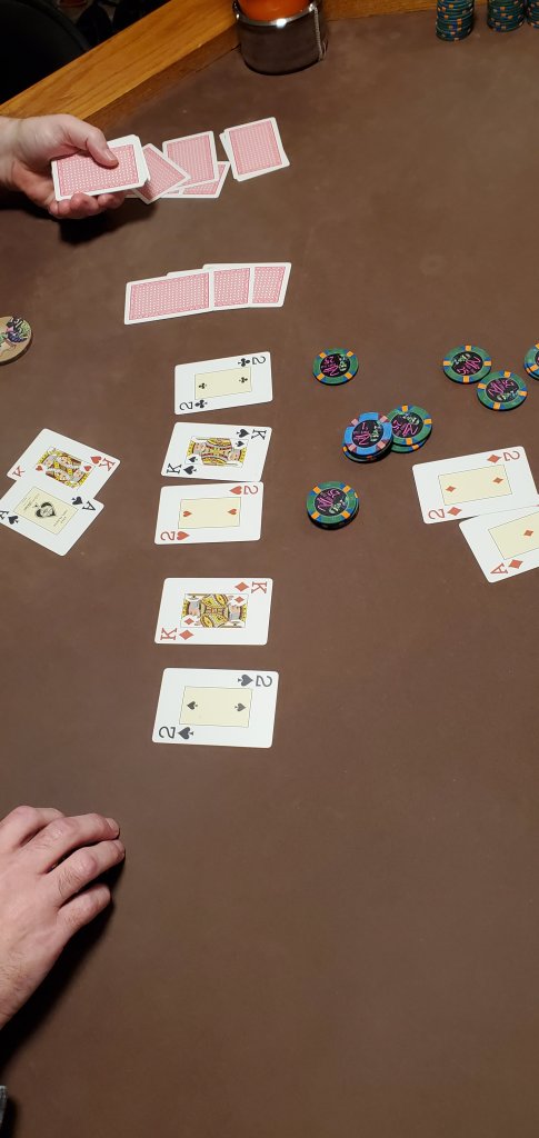 Once there were 3 players out, the cash game ($0.25/$0.25) started. It built up over time to 2 tables and halted when we got to the final 3 players in the main event. Mostly NLHE was played in the cash game, but Omaha did make an appearance (and was new to several players). One weird NL hand had a couple people to the flop of 2K2, with betting down to 2 players. The turn was another K. The river was another 2. I wasn't in the hand, but expected either this to be flush over flush (with one having a K) or them to both have the K thinking the other does not. Instead, one player had the case 2!