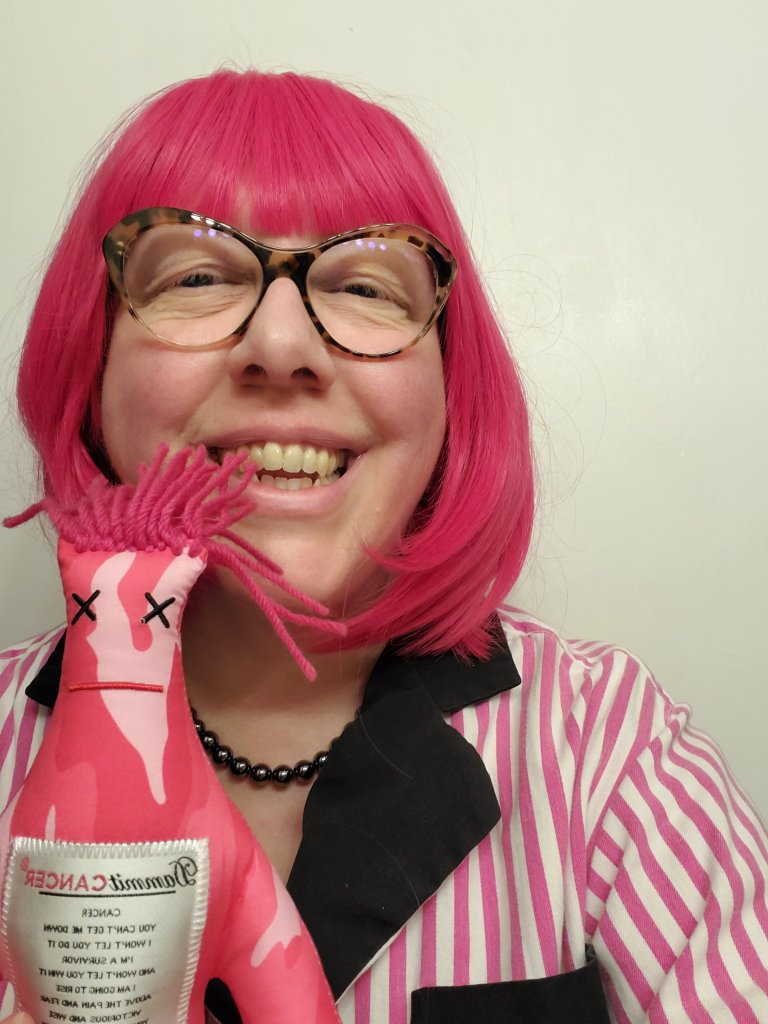 As chemo is doing it's job and I'm low on hair, I dressed up as Kublai (our zombie) in "girl" mode with a wig! I didn't know when I ordered the wig it would match my Dammit Doll! LOL