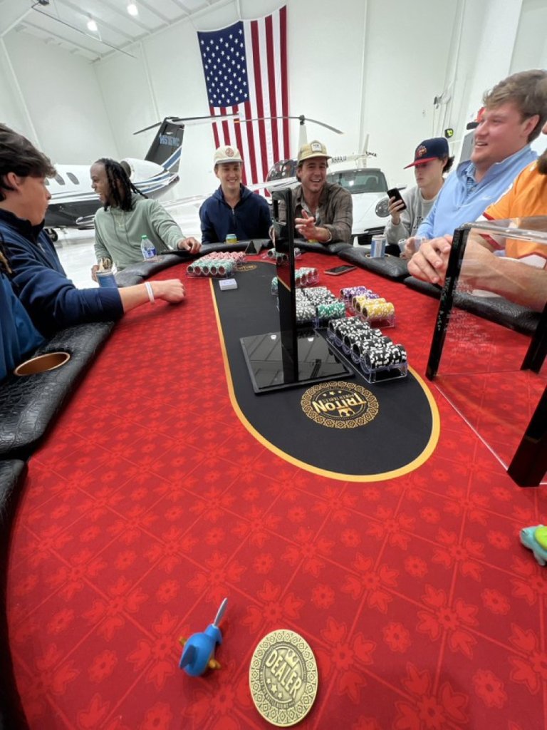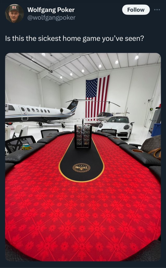 Saw this online and had a chuckle. Private/home game with a YouTube streamer in an airplane hangar with a private jet, helicopter, and Porsche. Decent table. Awful chips that might be available via a quick Google or Facebook marketplace search. Kinda crazy.
