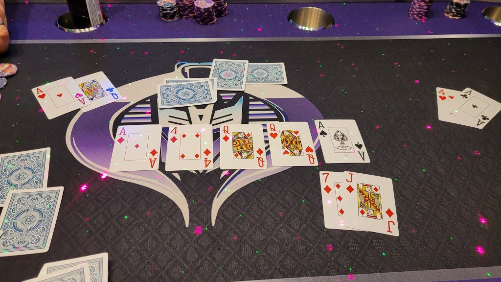 My KQs goes all in pre. JJ folds. K9 calls. Bad beat of the night, K9 catches a river straight.