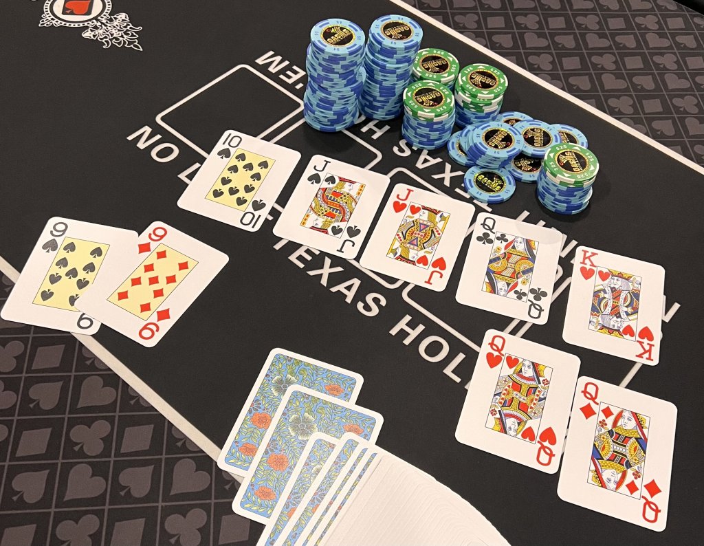 My KQs goes all in pre. JJ folds. K9 calls. Bad beat of the night, K9 catches a river straight.