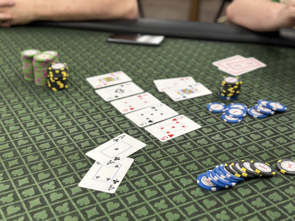 Once an hour or so we like to get degen and play a No Limit Omaha hand... this one went $300 pre flop, and more than 2K all in, 3 ways, on the turn. (Board and the three tabled hands) 3 way chop ending in relief for the two of us that didn't have the flush redraw