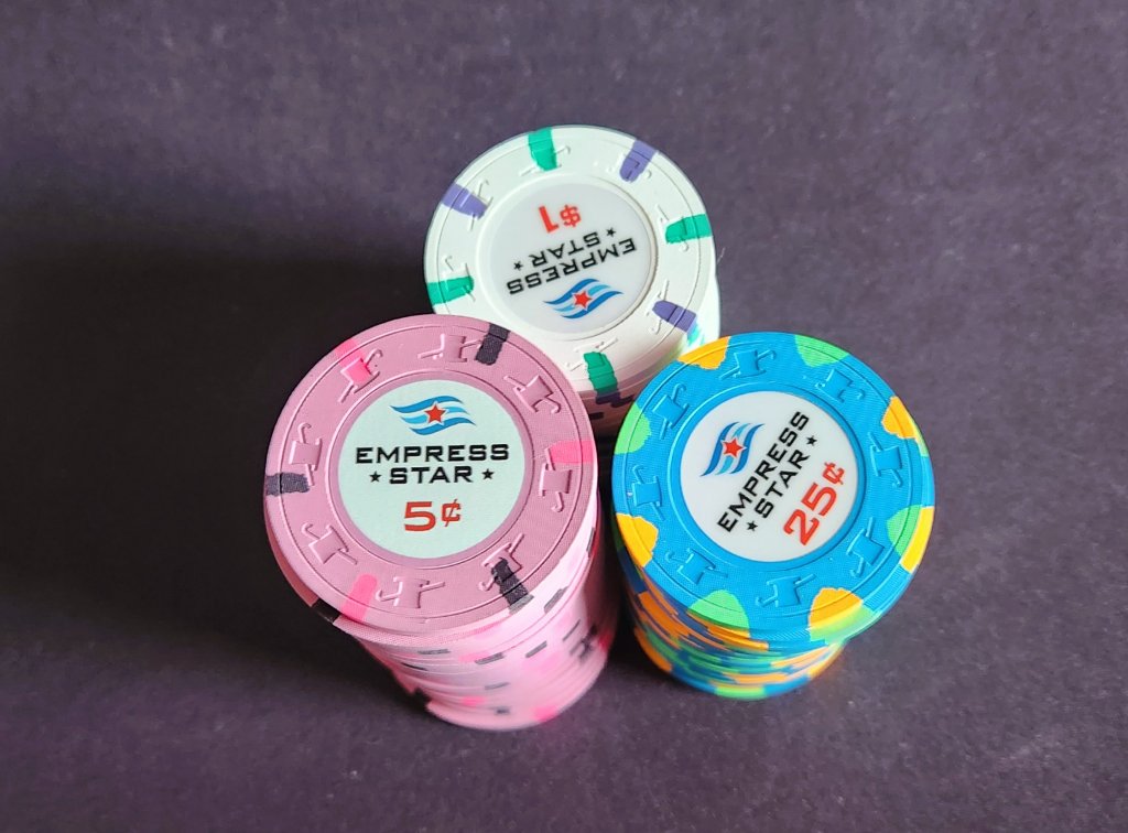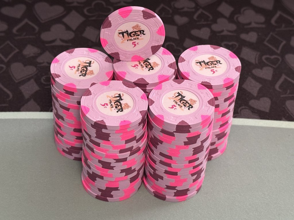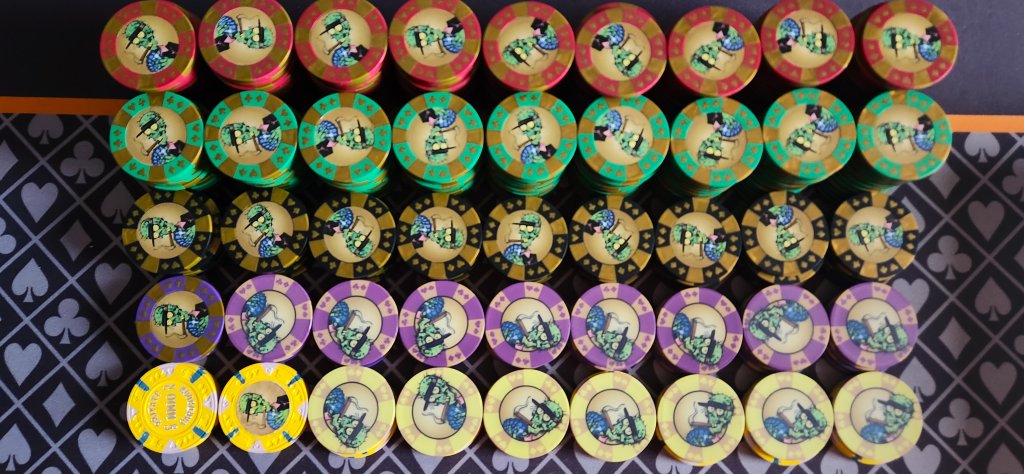 Chips set up for next weekend's Ladies Night. Pulling out the original (T5 base) Zombie chips for the event, supplemented with ceramic replicas of the originals, and Paulson Private cardrooms. Sometimes referred to as the Frankenstein set because it's pieced together, it is a lesson in "get samples", and "get more than you need".