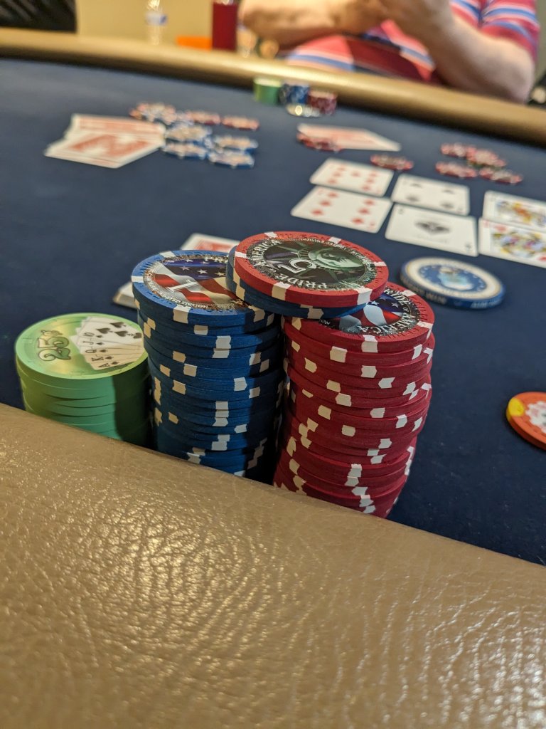I don't think I've seen those Pride of America (?) chips before. Those are pretty great. Not a fan of the FoC chips, but hey, if you want me to bump every pot of the night to $1 just so only the beautiful chips play, you've found my leak.