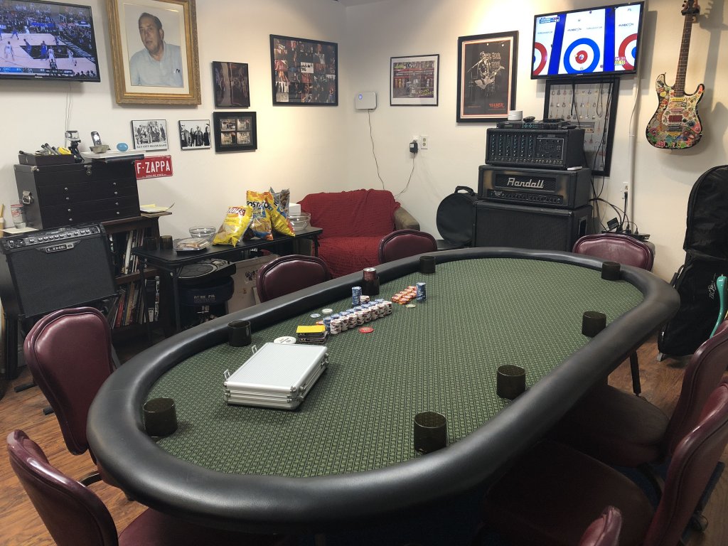 I converted my garage last year to my office/studio/poker palace (see above) but also had my first game in there last night. I'd been playing in the house but the setup and the noise drove me to try the garaffice and it worked out great.First garage night, didn't have enough players for the planned tournament so we audibled to cash (my preference anyway).