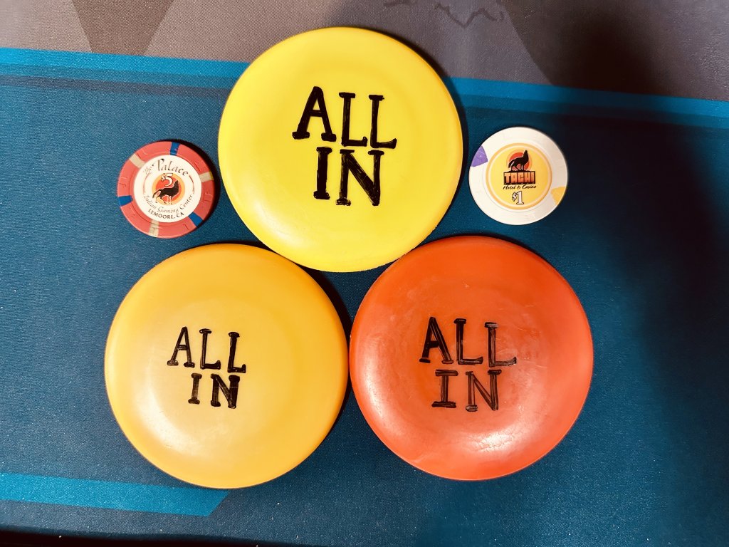 I’m going to paint “All-In” on mini discgolf discs so that I can let ‘em fly across the table to players, thus combining my two favorite games!