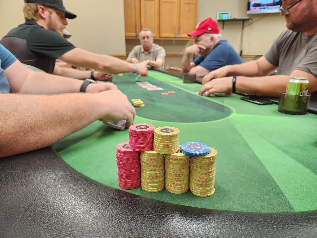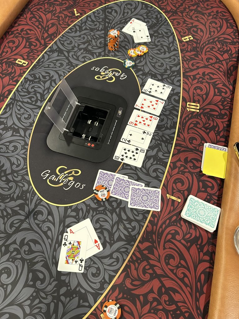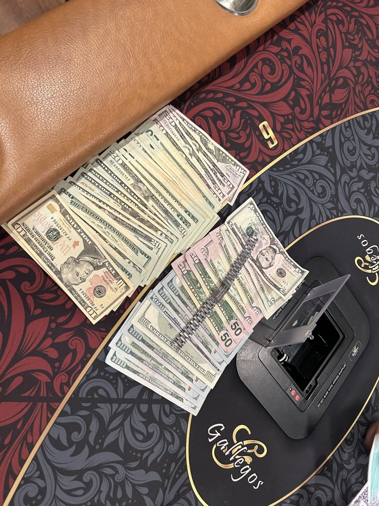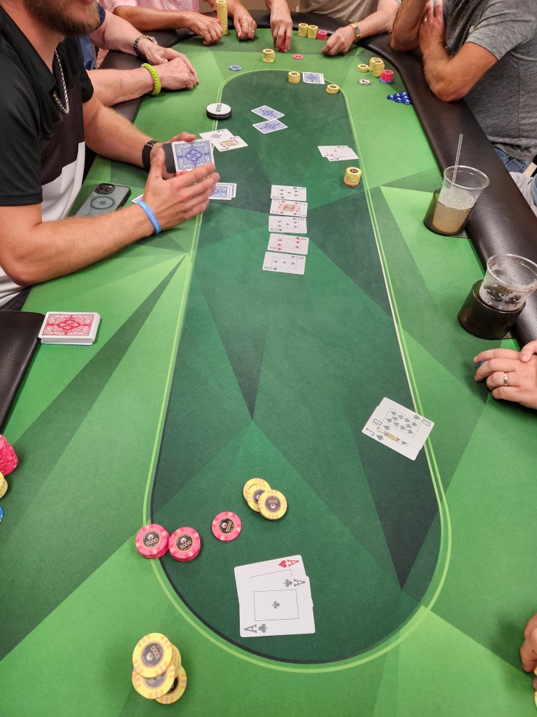 Played a buddies house last night. He used my new Tina hybrid chips.. $.25/.50 NLHEor two cash tables. LAST hand of the night we are down to 5-handed, 4am, we do a $3 bomb pot, double board NLHE…. One dude scoops 3-way all in with A♦️ J ♦️…nut str, nut flush for $800, busts host and another guy.. this is the aftermath.