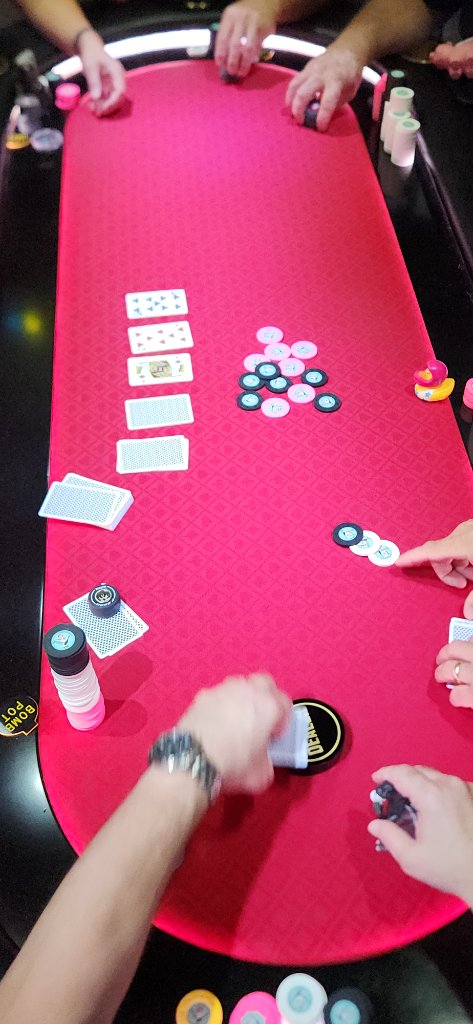 My first 9 months playing in @SPRs game has been fun but this might have been the best so far. This first pic was the third hand of the tournament. I had just won a big pot before this and then got my straight flush paid off. @Dread_Pirate_Roberts helping push the chips my way. On his right, @Vinyard is letting the villain know I won the chips. And to his right is @Godzilla28 in shock at what he is seeing.