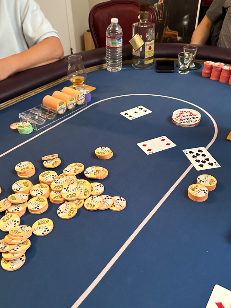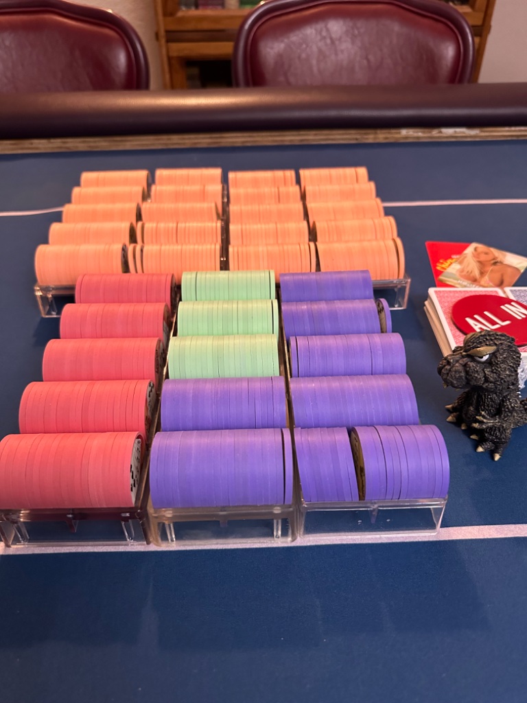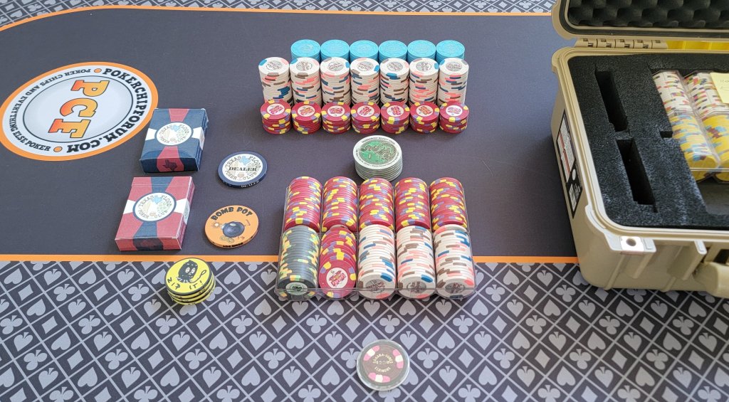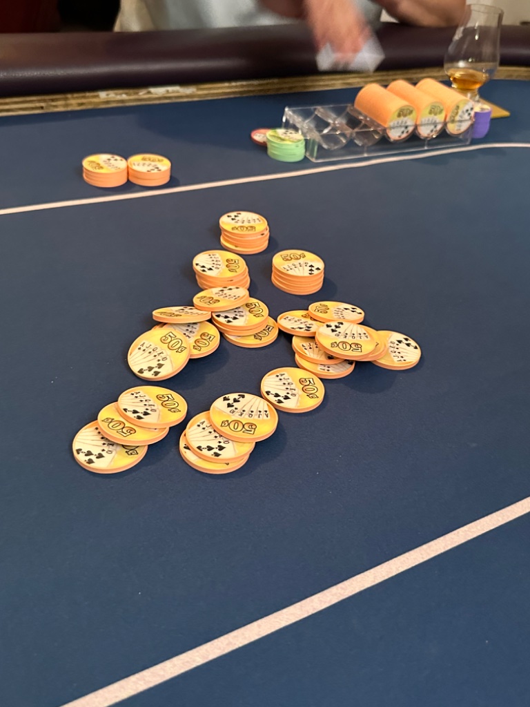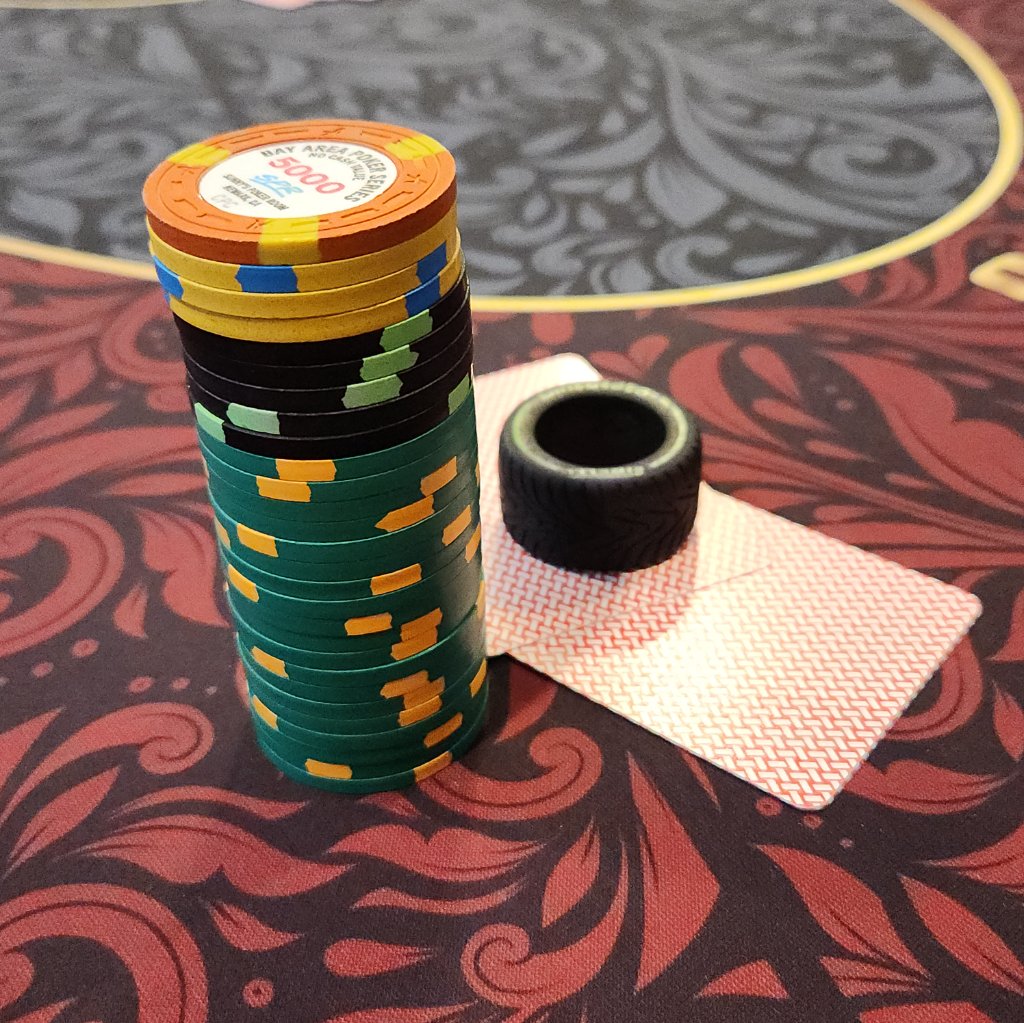 Used KEMs, insane I know! One player loved the texture but 3 others hated how slippery and soft they were, so Ill be back on my FS/Prestige/Kings grind next game. Baby stakes NLHE, still teaching them how to play. Usually let everyone deal but the table was a bit cramped and the fan was on so I just dealt the whole game and had people shuffle.
