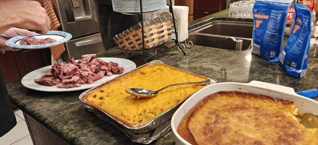 There was also Mac and cheese, and corn pudding. Meat looks almost shredded because it was tender enough to cut with the back of a knife. Which is good, because I don't have 20 steak knives.