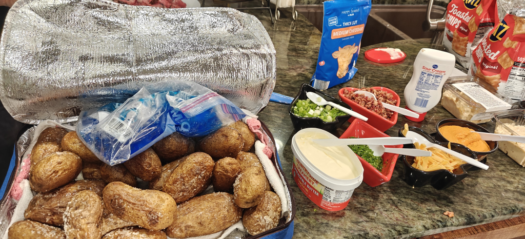 Baked potatoes, with all the fixings (well as many different topping as will fit into 4 suited bowls)
