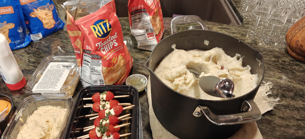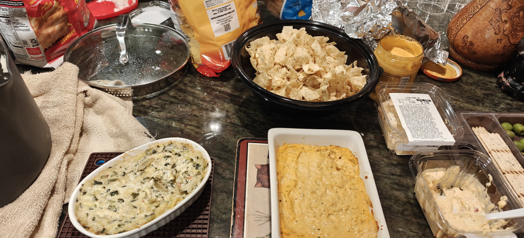 Multiple dips - crab, spinach, buffalo wing, and something... I want to say... hot and cheesey? Nacho cheese as well, which probably ended up on more potatoes than chips. Charcuterie board as well.