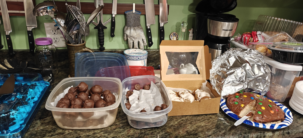 Chocolate covered Butterfinger balls (in adult and pre-pubescents sizes), pumpkin-spiced cookies, and an M&M white cake.