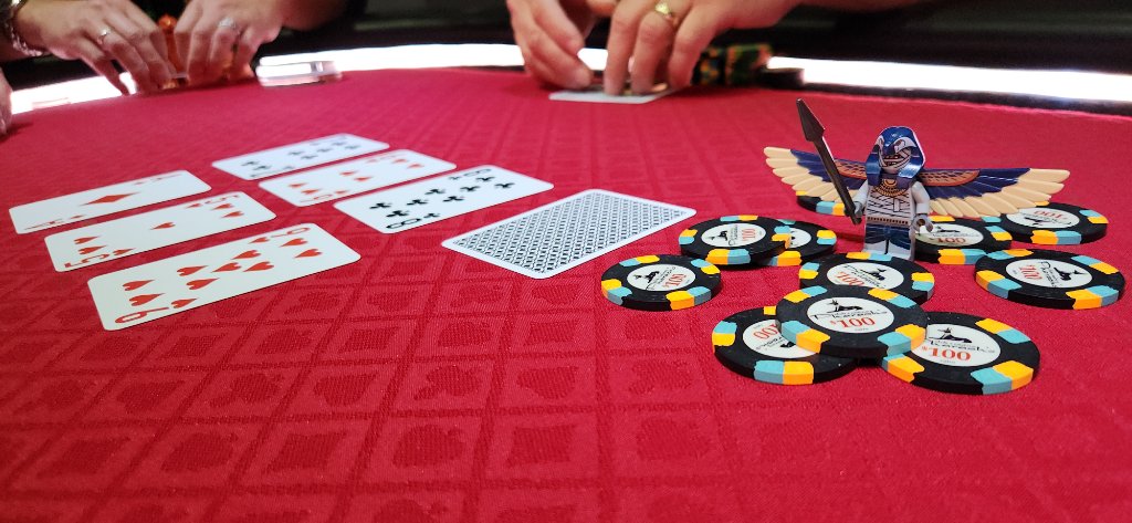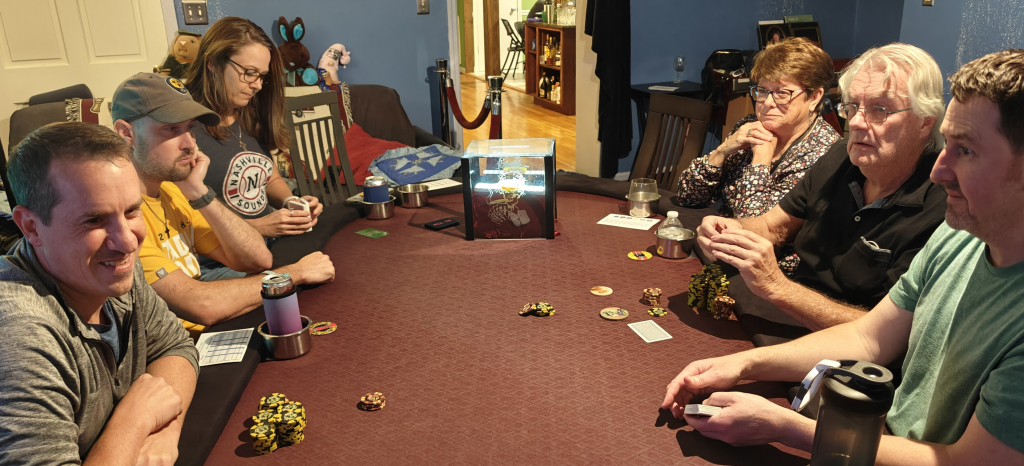 The Copags I brought came in handy cause someone spilled beer all over the table in the first hand, but when I suggested using two decks they looked at me like I had 3 heads.
