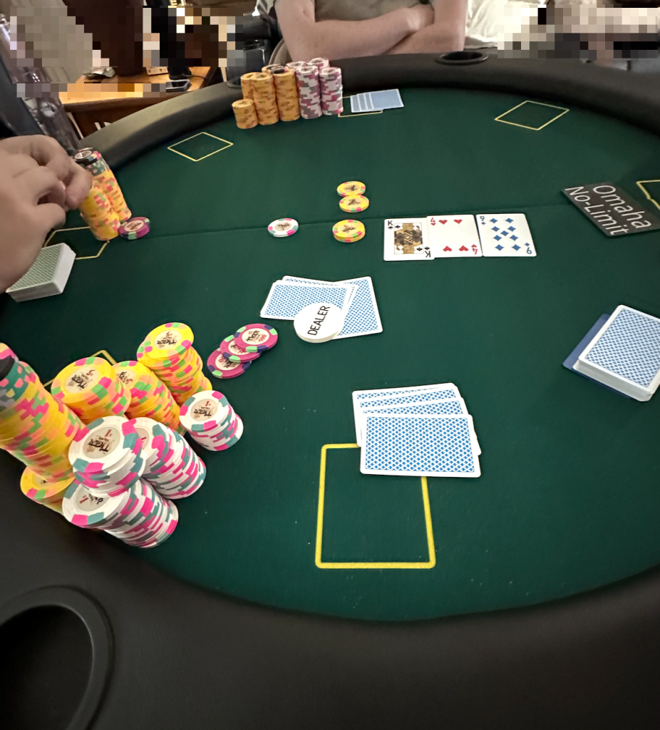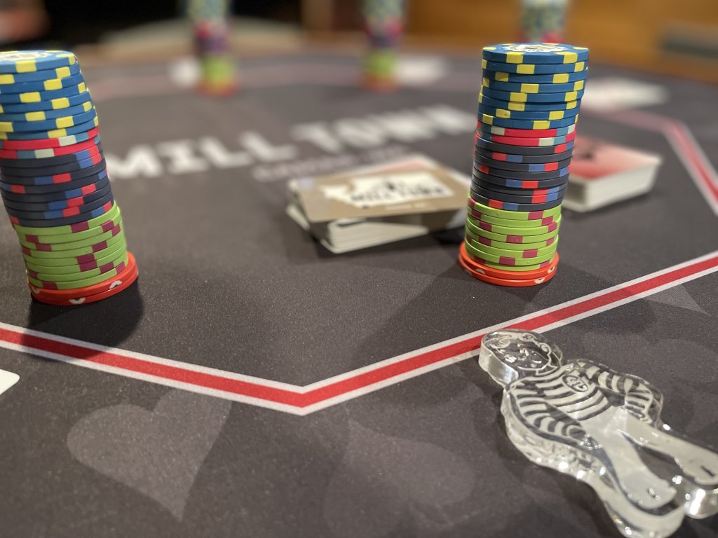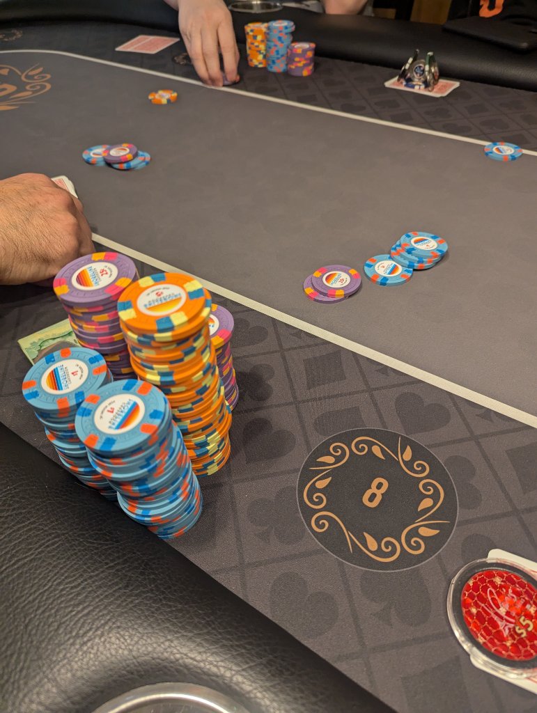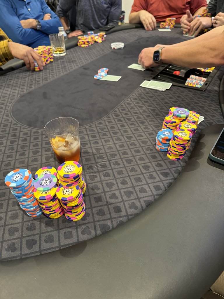 Pic 1 - apologies for the double post, but I started the week on Monday with my Diamond Jacks chips and Statesman cards, at a friend’s house with a foldout topper on top of deck tables and an assortment of chairs.