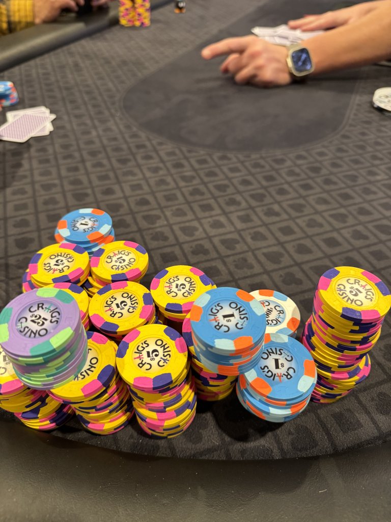 I was down for awhile, in for $50 then bought another $20, then another $20 (since we cant fully rebuy, odd structure where the chips stay on the table but cash goes away). Had a few great hands, caught some bluffs and got lucky a few times. Spoiler alert I did very well, but the slow pace of play and the confusion over pots annoyed me more tonight.