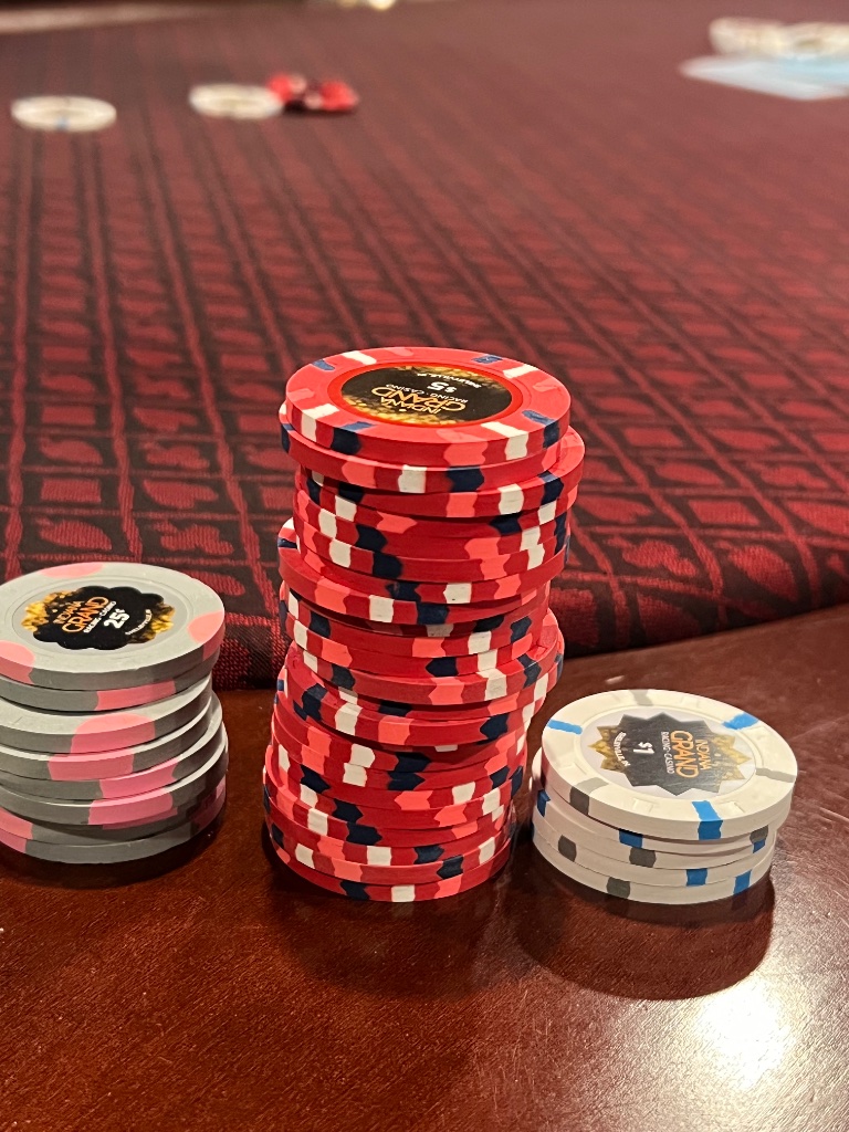 Not a card dead night for me, but rather a night of suck outs, counterfeits and too many outs syndrome... going against me. Who has that rack of reds on the table anyway...