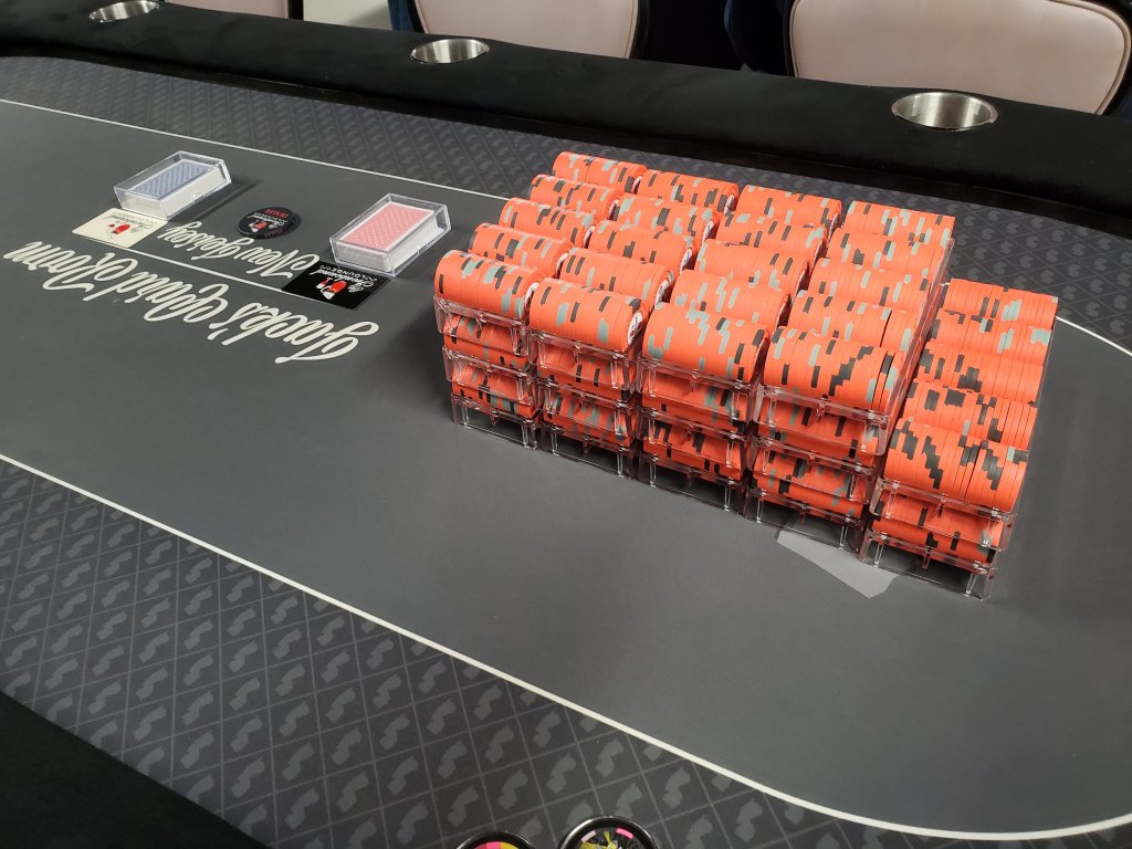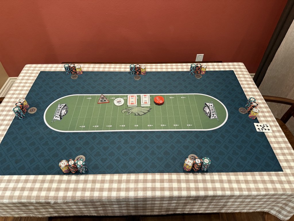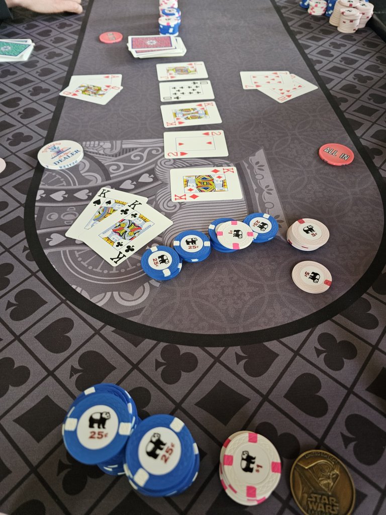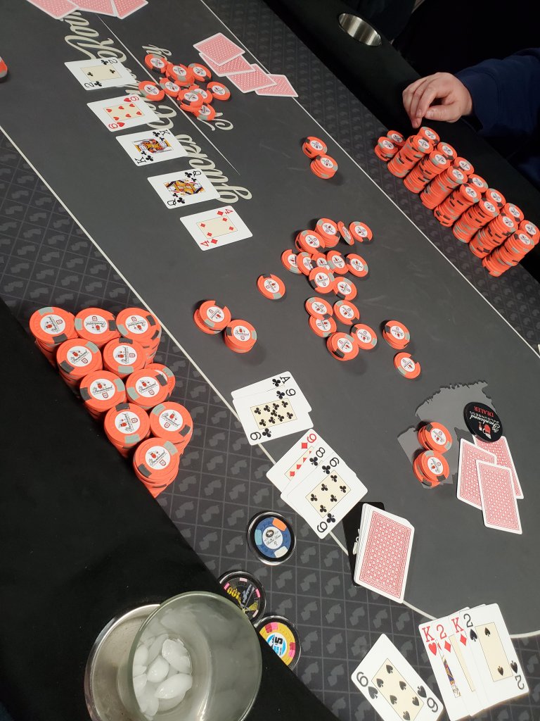 Game two on the fresh table yesterday. 7 players, 18 total buyins (rebuys + addons) so healthy prize pool!