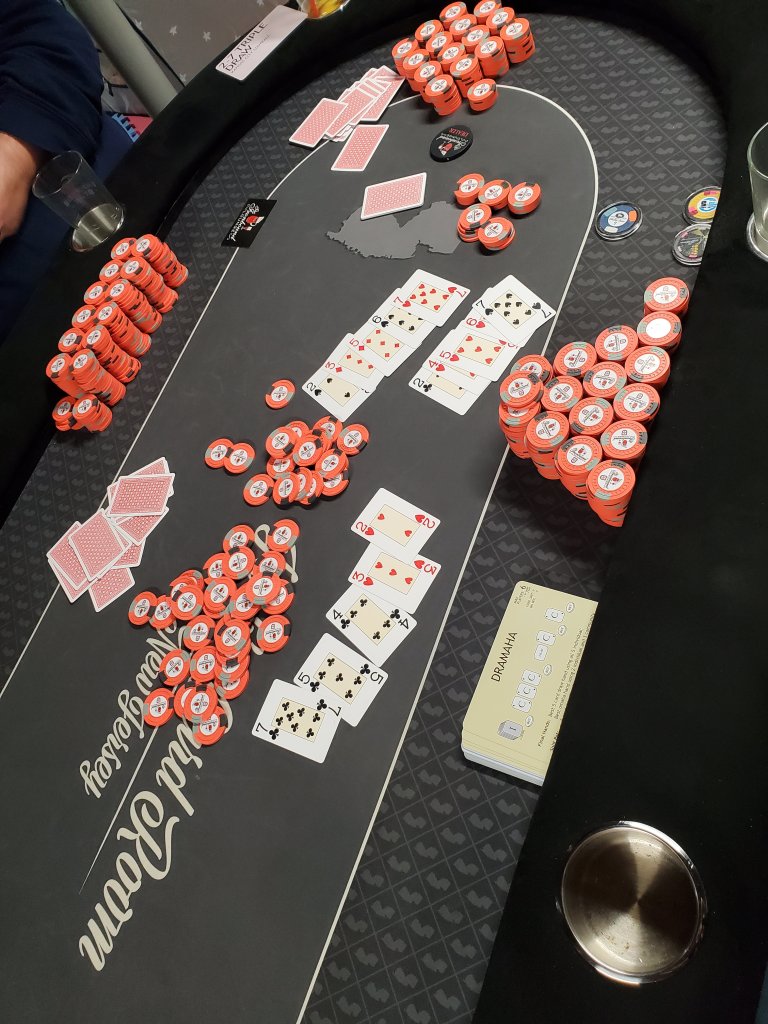 Sunday afternoon snow day in the Rain Town USA. Visited by @Saditsfact and @Franzister who played very well respectively. Tigers in play. Learned about their black light abilities. Food by Voodoo Doughnuts. Faded Spade FSX 4-color cards in play. Game called early due to ice and bad roads. In for $50 plus $5 HHJ, out for $275. @Saditsfact tied for the HHJ with A6 on a JJJAA board. Only full house of the afternoon.