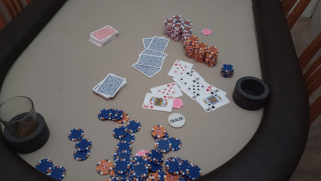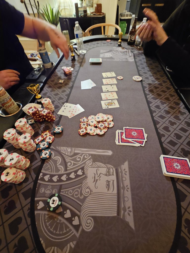 This is how I found the table this morning. My final full house to win every chip on the table (£120 pot). 4 or more hours of rum drinking beyond midnight means I didn't remember any of the details.
