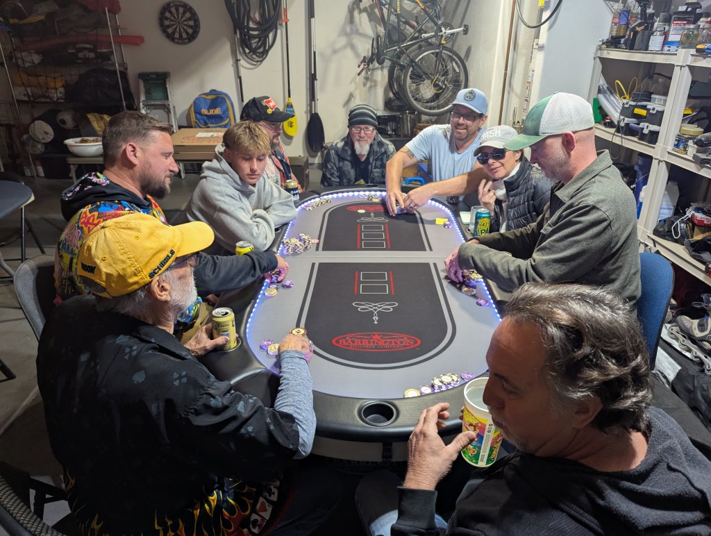 Final table of the first (of what hopefully becomes a monthly) game in my garage. I was expecting 16 players but we only started with 12. I unfortunately wasn't still involved at this point. My dad won and my son took 2nd place. I was the only loser in the family this night.