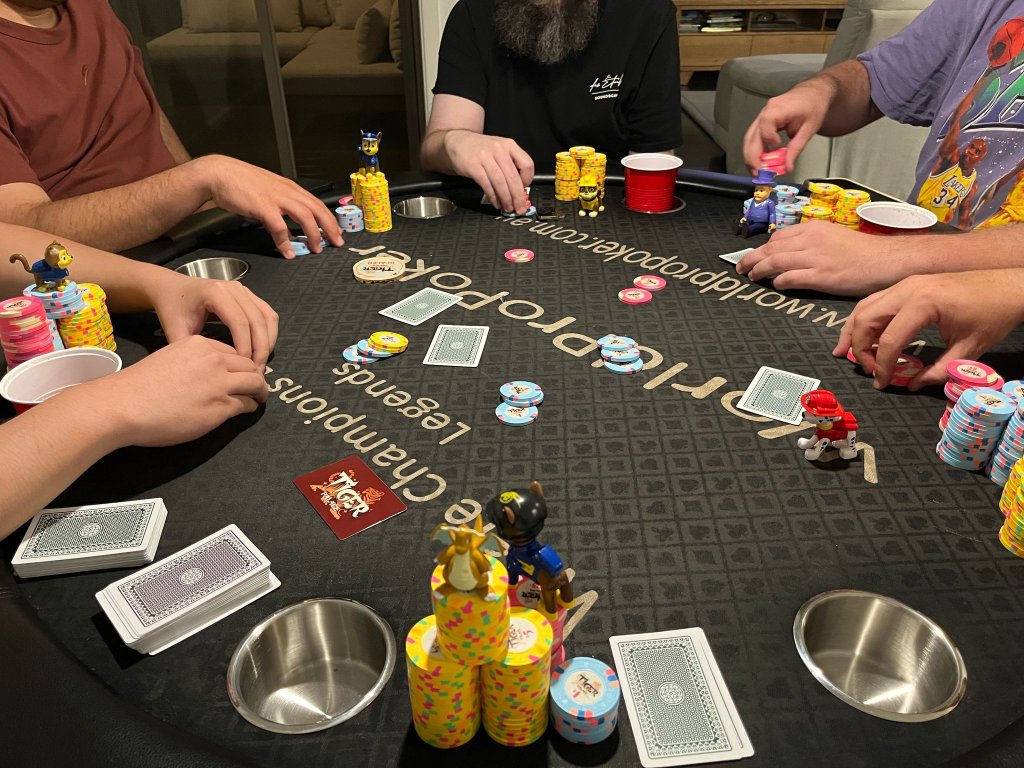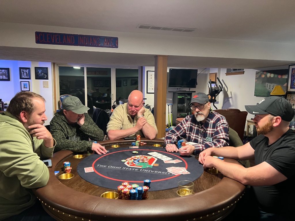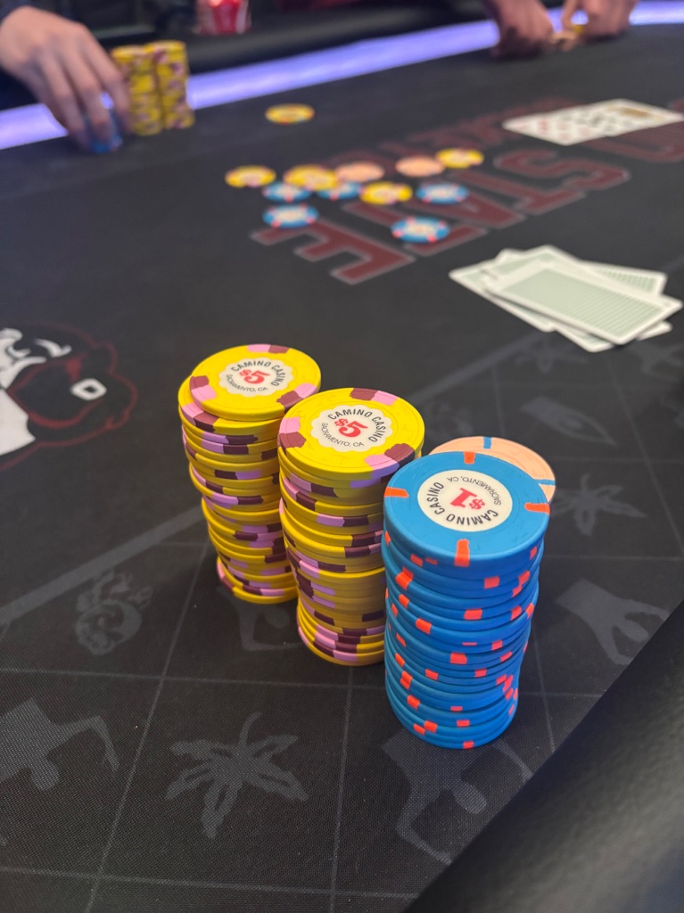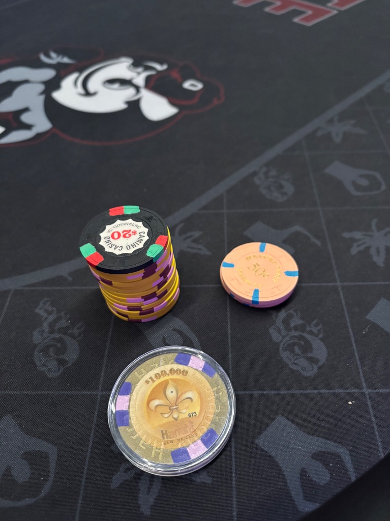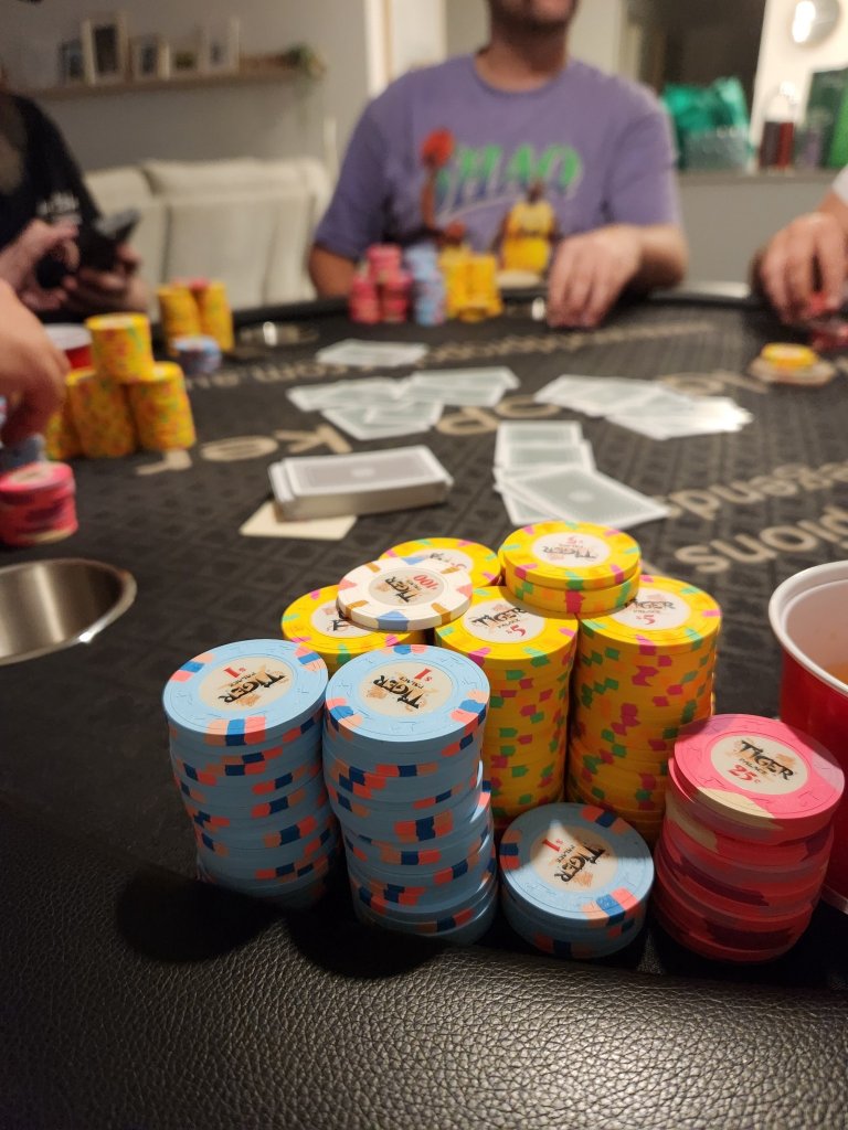 Hosted my first tournament game in many years and got to put in play my new Tina chips. Small 8 player tournament to work out any issues with hosting. Started off with quad 3s against a full house. All down hill after that. In for $40 out for nada.