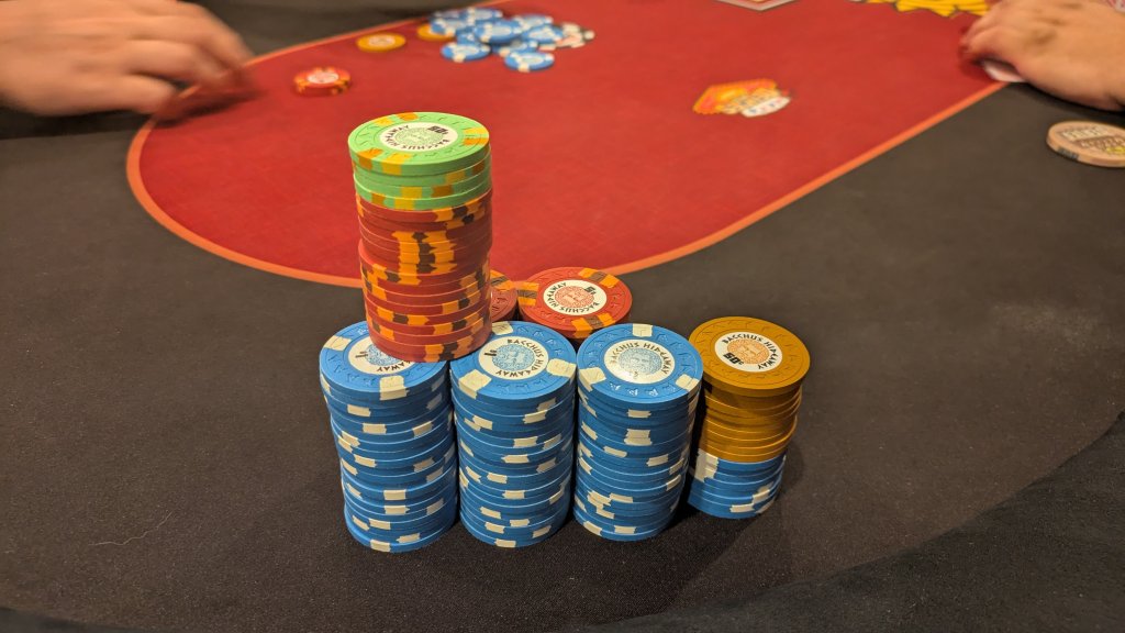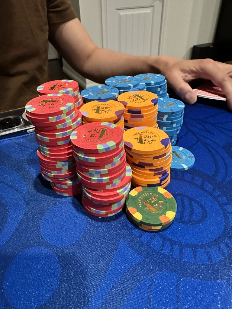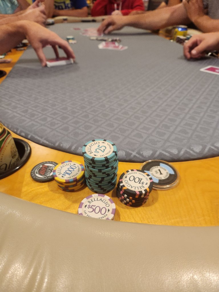 This game also has a policy that cash plays on the table and no more chips are bought from the bank, only other players. Theres one player in particular who is known to be weird about this, he'll put $300 down if hes down $20 bucks but put it under his phone. No one else seems to care but its sketchy. Consensus at the old man table was that I only needed to know how much it was after he went all-in. So I could be playing against a stack of $30 or a stack of $300 and that information wasn't pertinent until I risked it all. We weren't arguing but I was pointing out the problem in doing it this way and the host didn't seem to care, so oh well. $50 cap game becomes awkwardly mystery deep-stacked.