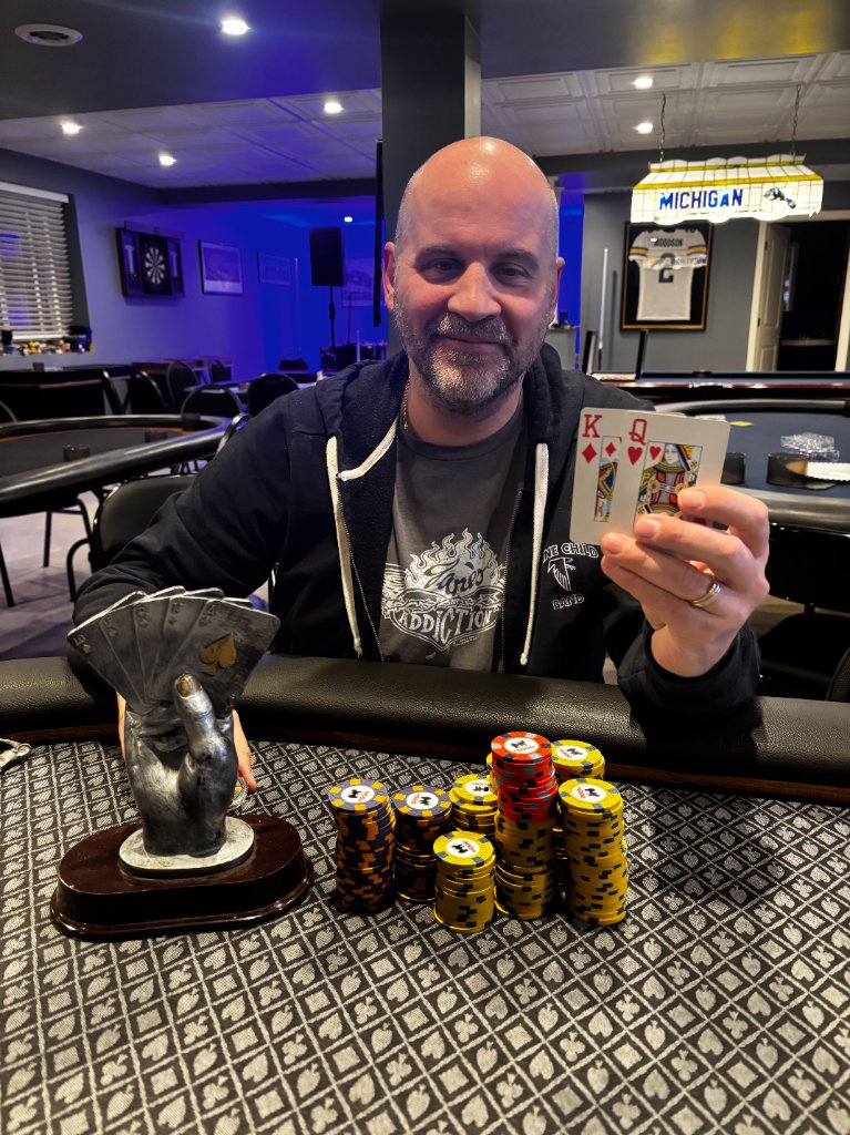 Got down to 4-handed and I knocked out two players giving me a 130k to 35k chip leader heads up against the hosts' college-aged son. He held his own and played well, fighting for chips. On the last hand, I made second pair with a Broadway draw and he flopped a flush draw. He shoved, I called after getting a count and queens held.