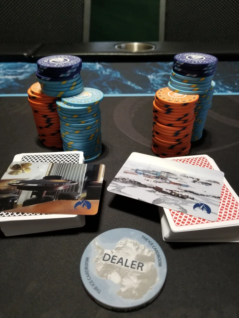 Going-away game! Bringing the Ice Cardroom set back out, inspired me as a researcher and has led me here. Dealer button, chips, cut cards, and bowling shirt to represent Palmer Station, Antarctica. Thanks @mattross1313 for the design help, beautiful.