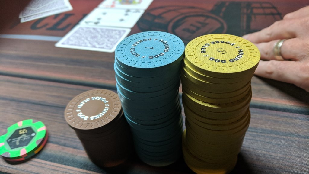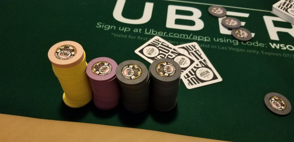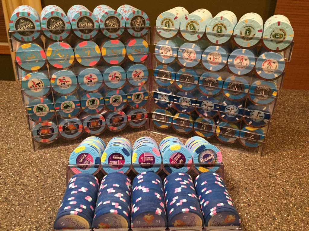 Interesting way of tracking who's money you've actually won.They pulled from my OFCP set, which is 12 racks of different blue $1 chips. Each player got a rack, so it all works (albeit a bit tilt-inducing)!