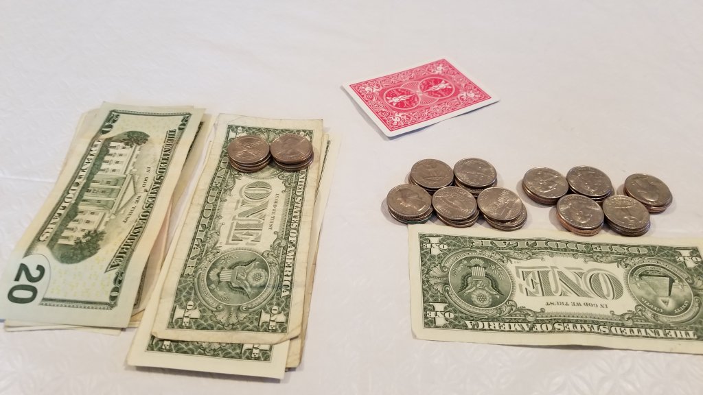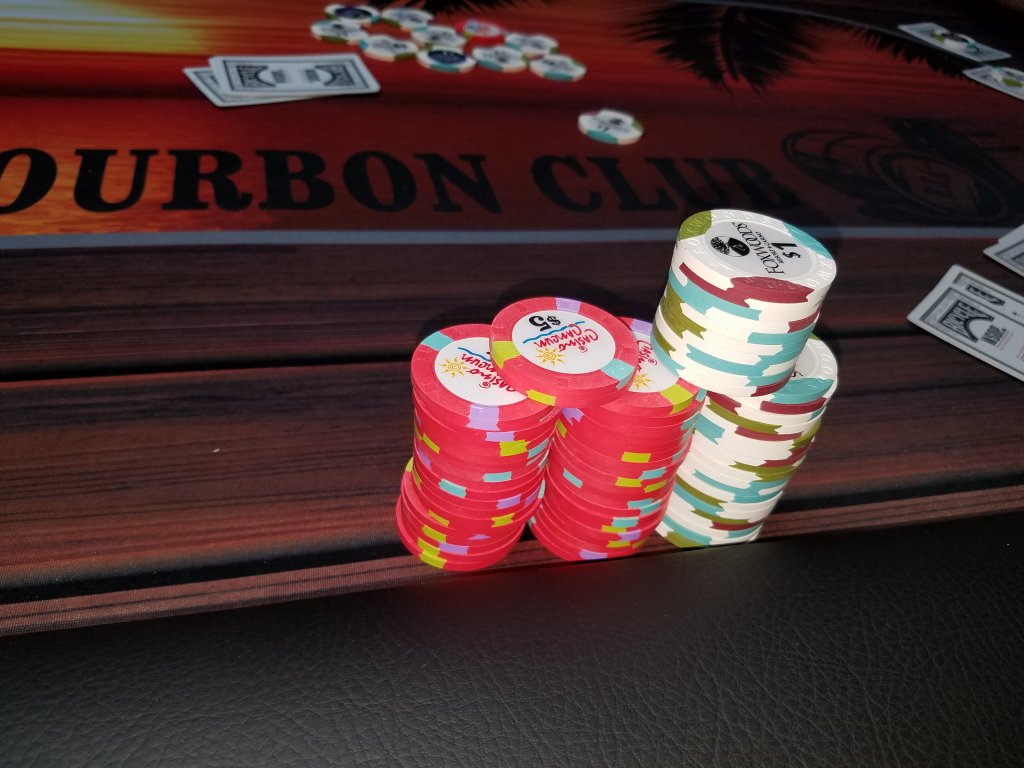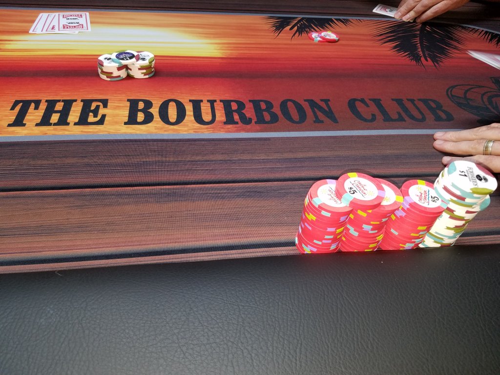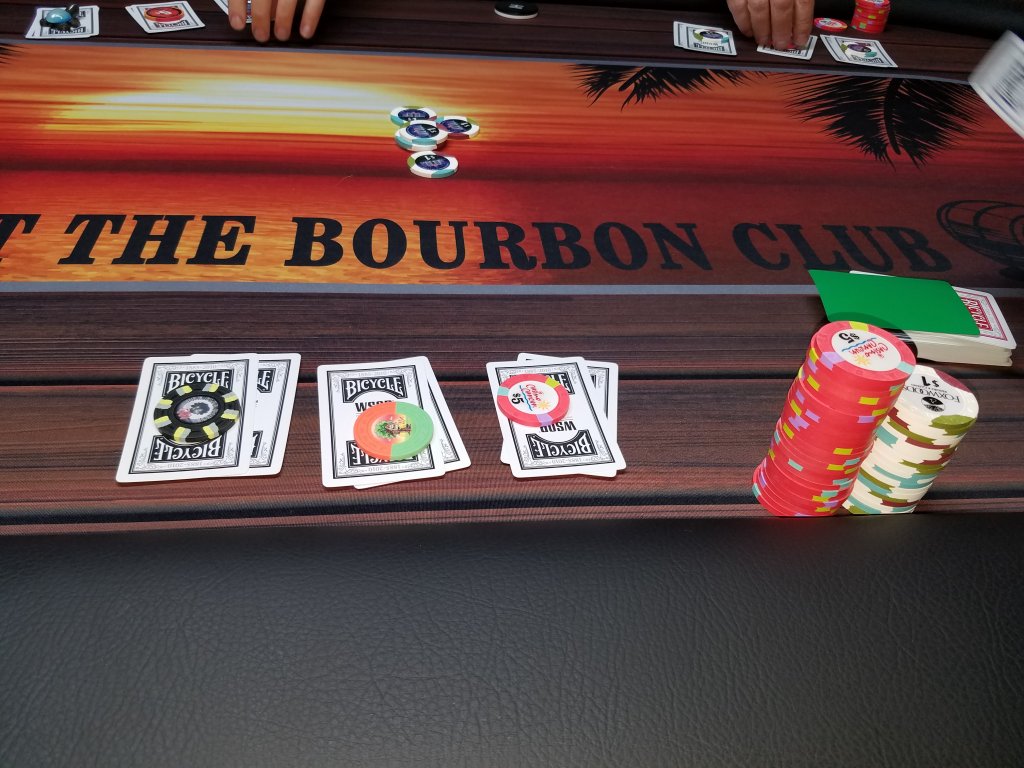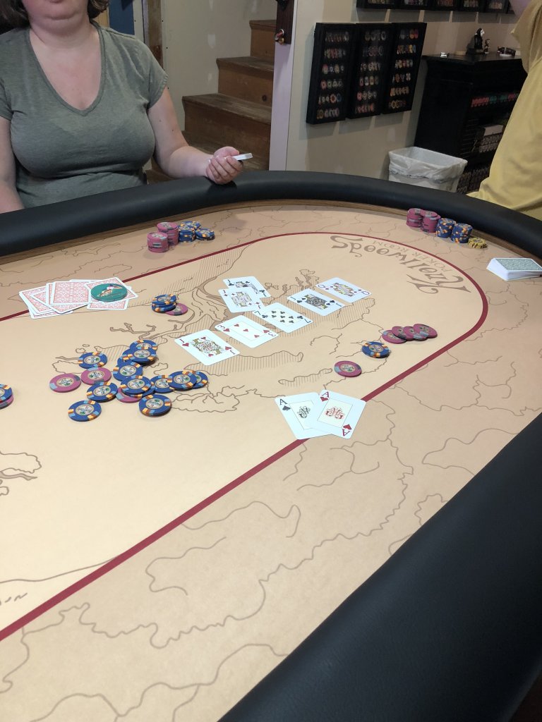 One of two tournament tables. Had 17 last night. This is my dining room table covered with a homemade topper (waterproof outdoor fabric fused with closed-cell foam, and a leatherette backing so it doesn’t stick). I made it about 8" long around the sides, so it just hangs over the edge like a tablecloth. Works great, easily removed, don’t worry about spills, and the cards move well on it.