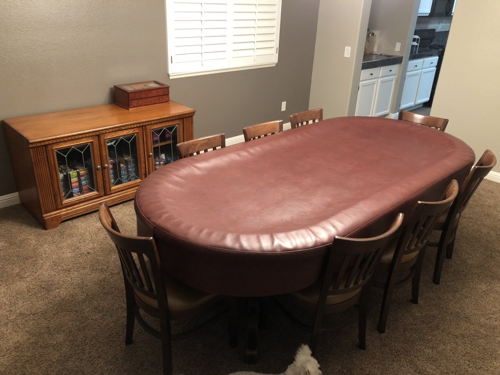 Awesome table cover, looks custom made, where did you get it?No chip pron yet, but just got the table and chip credenza set up in the new house. Will be ready for inaugural game next Saturday.