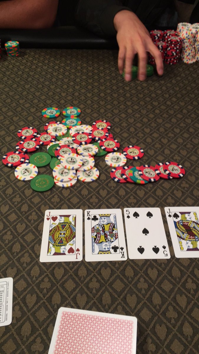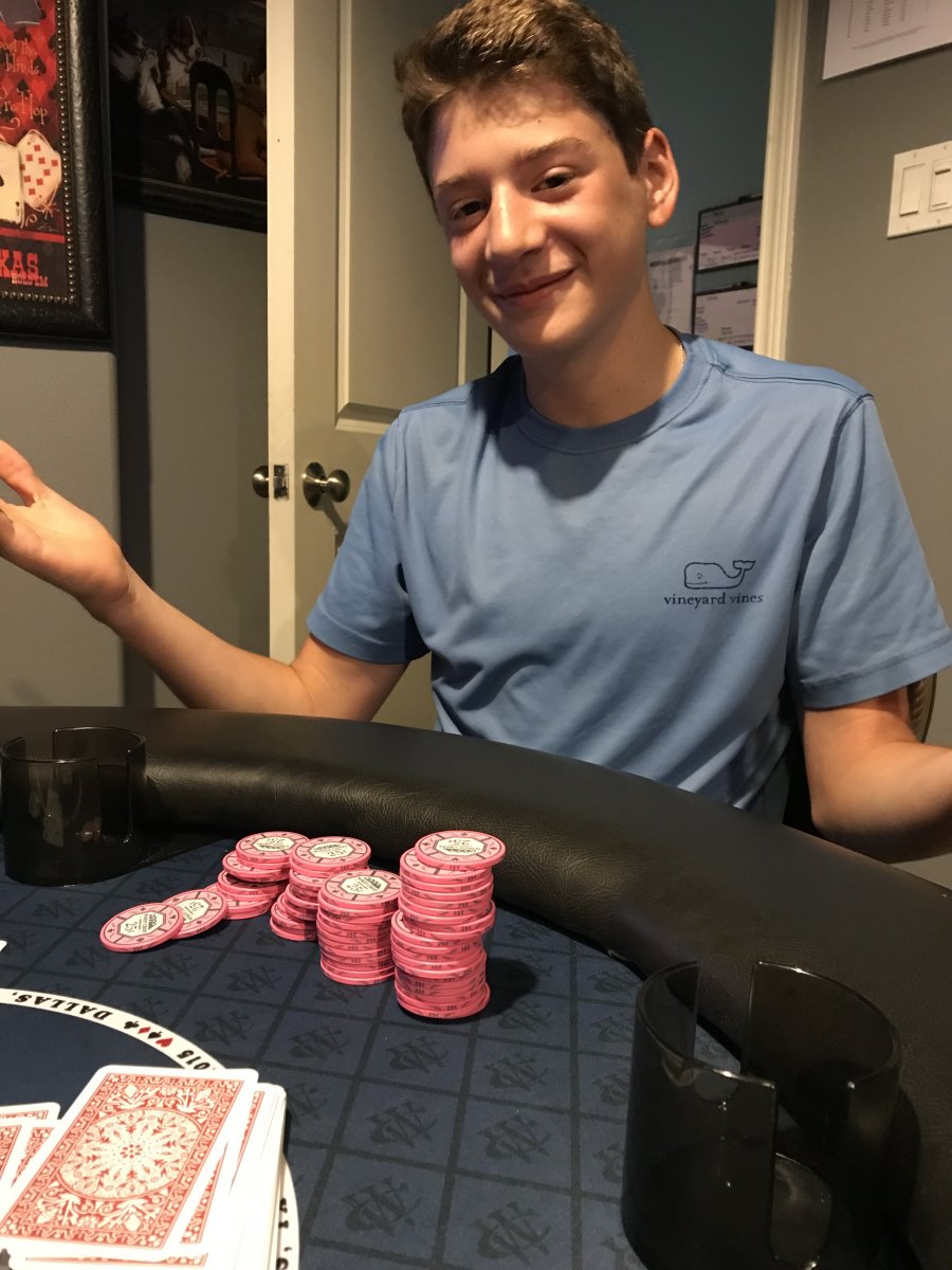 Poker against the boy while watching WSOP. $7 buy in. Boy wins. Poker sucks.