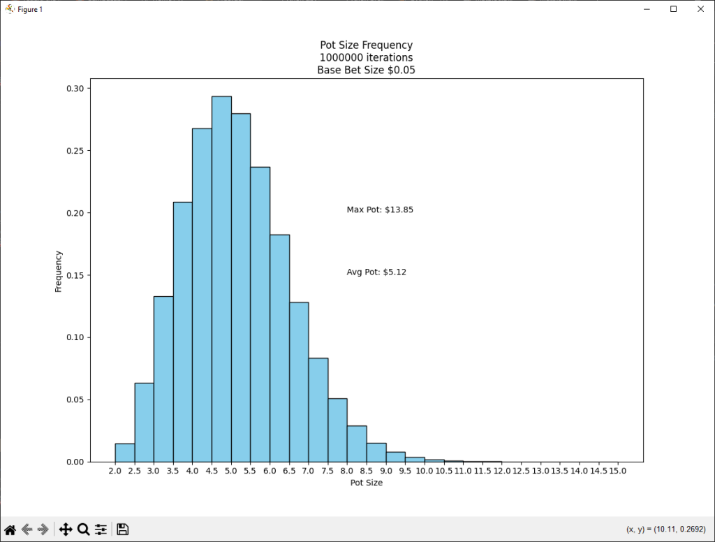 Pretty unsurprising the distribution looks like this. Average pot looks to be about 100 times the base betting unit, pots exceeding 150 times the base betting unit are exceedingly rare.