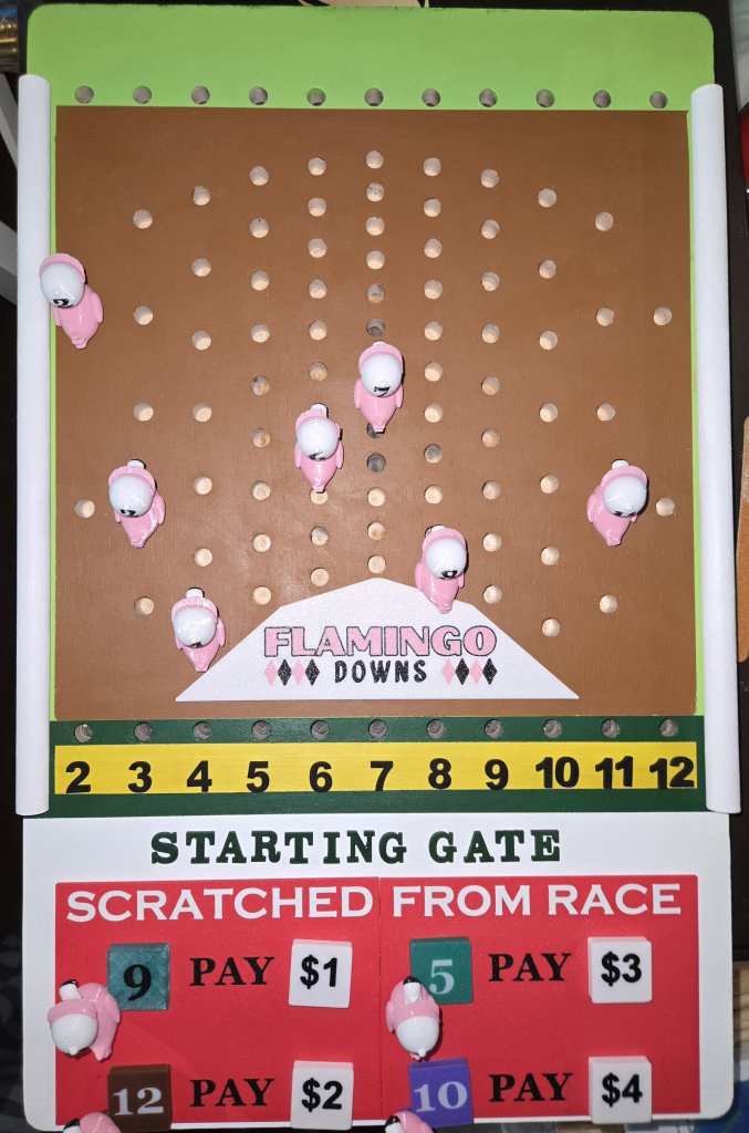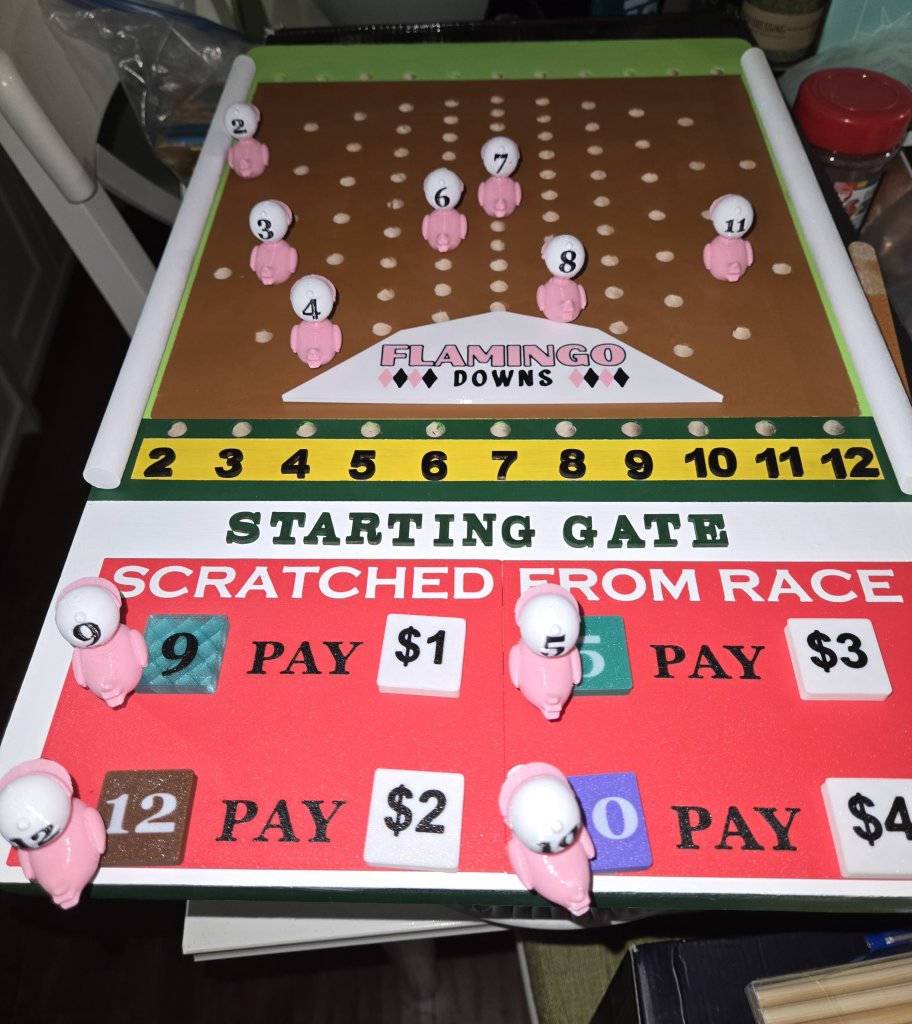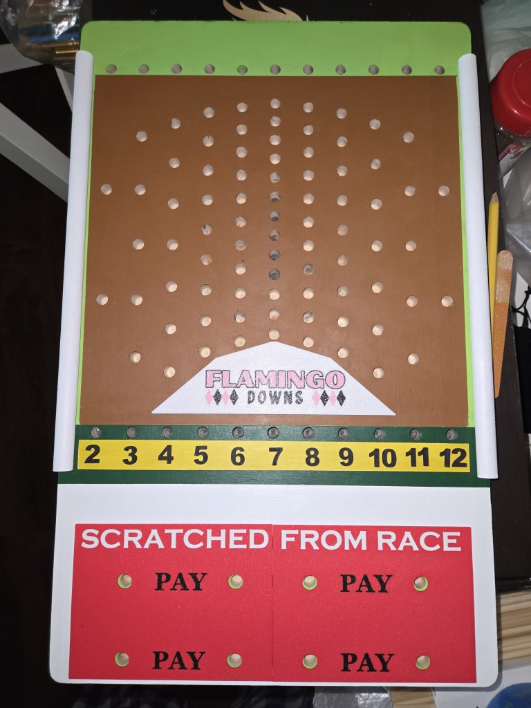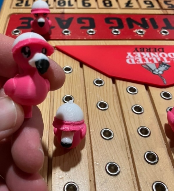 Enter @wonderpuddle and his awesome 3d printed upgrades for the game (which I can't recommend highly enough by the way) that allowed me to upgrade my horses to the flamingos you see below in a photo from his sale thread and to have a much better scratch area that actually matched my stakes.