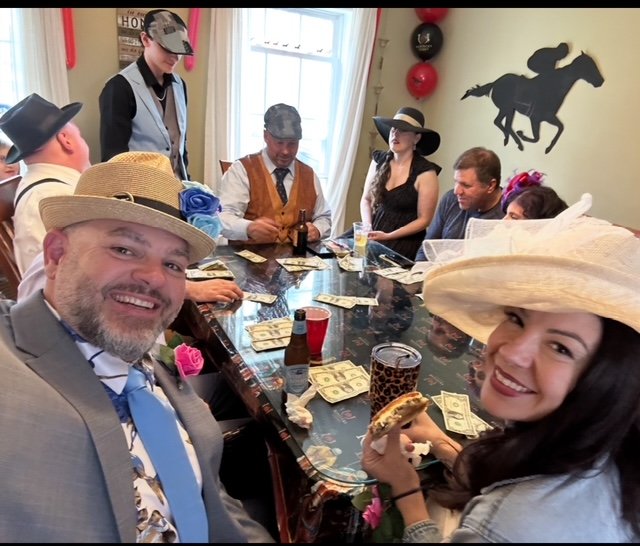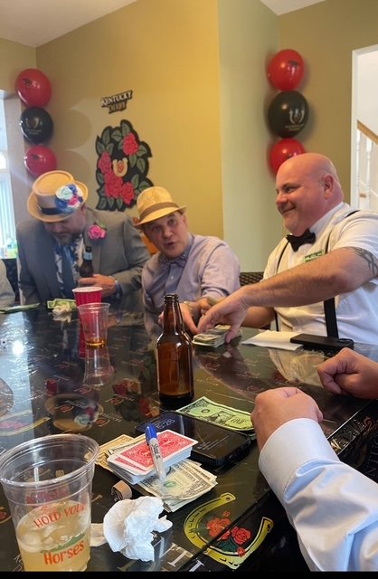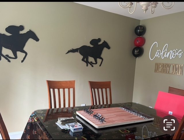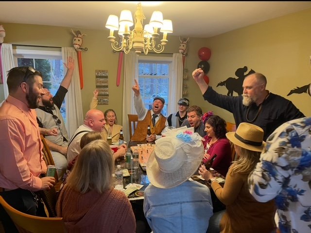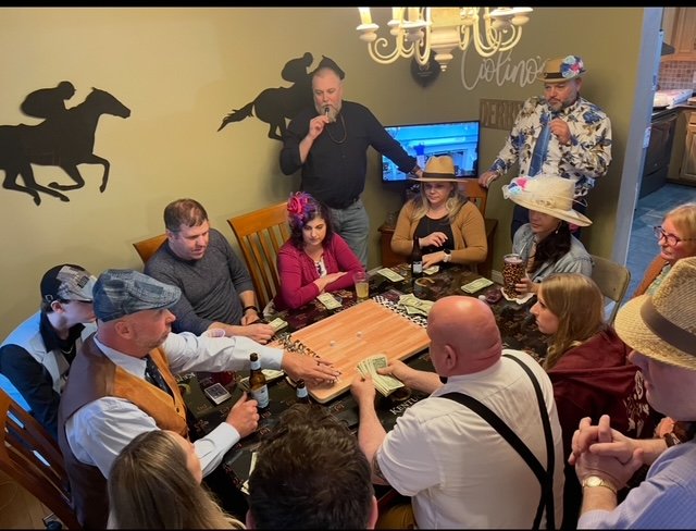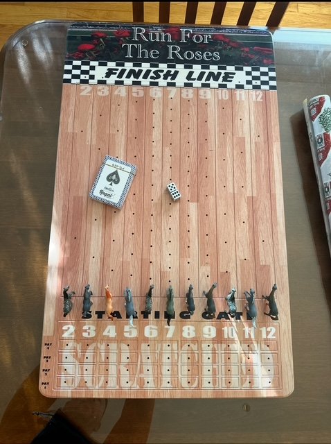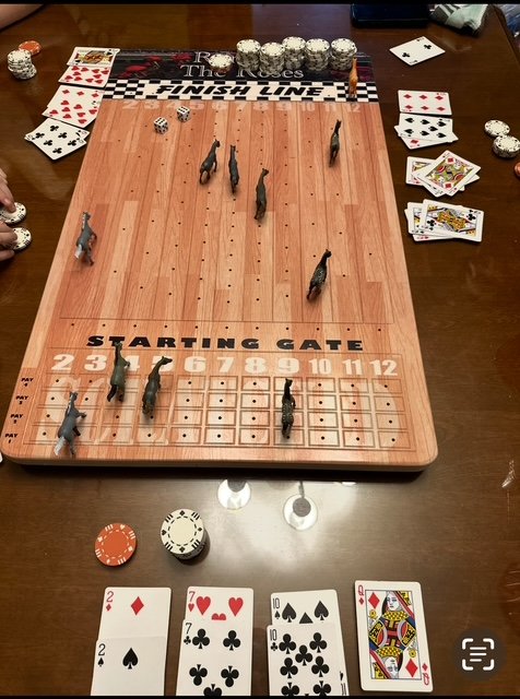 Holy shit these outfits are on point. We played last year on Diwali but this outfits durring the derby are amazing. Big Props to you guys!We play Horse & Bourbon a few times a year but the biggest, and funnest day by far is our annual Kentucky Derby "Run for the Roses" party. We have to break out two decks of cards because there are usually 12 to 15 people that want to play. Pay amounts are $1,$2,$3,$4 and $3 ante to play prior to race beginning of the race. Yes, we all or most of us wear Kentucky Derby outfits! I bought biggest board they had 30 inches by 18 inches