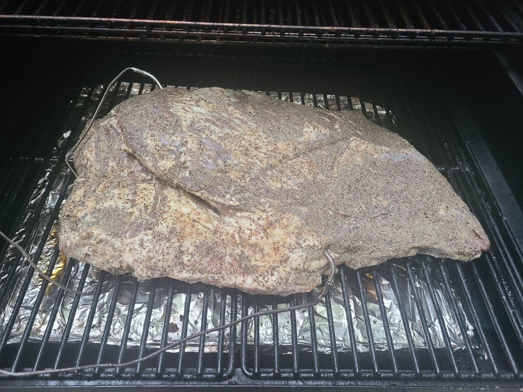 here we go...13# full prime packer w/ a light SPG rub going on at 6pm for a (hopefully) ~8am pull. it will be wrapped in towels and put in a cooler for the ~3 hour ride to my annual camping trip with my buddies where it will be served for lunch. wish me luck on timing this right!