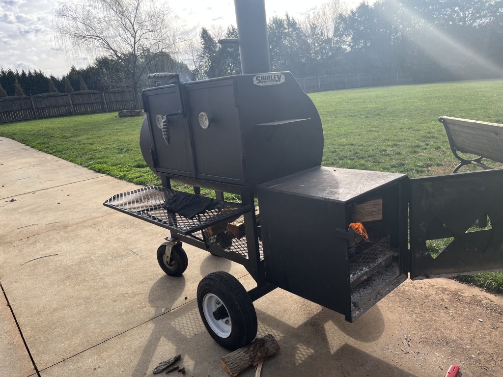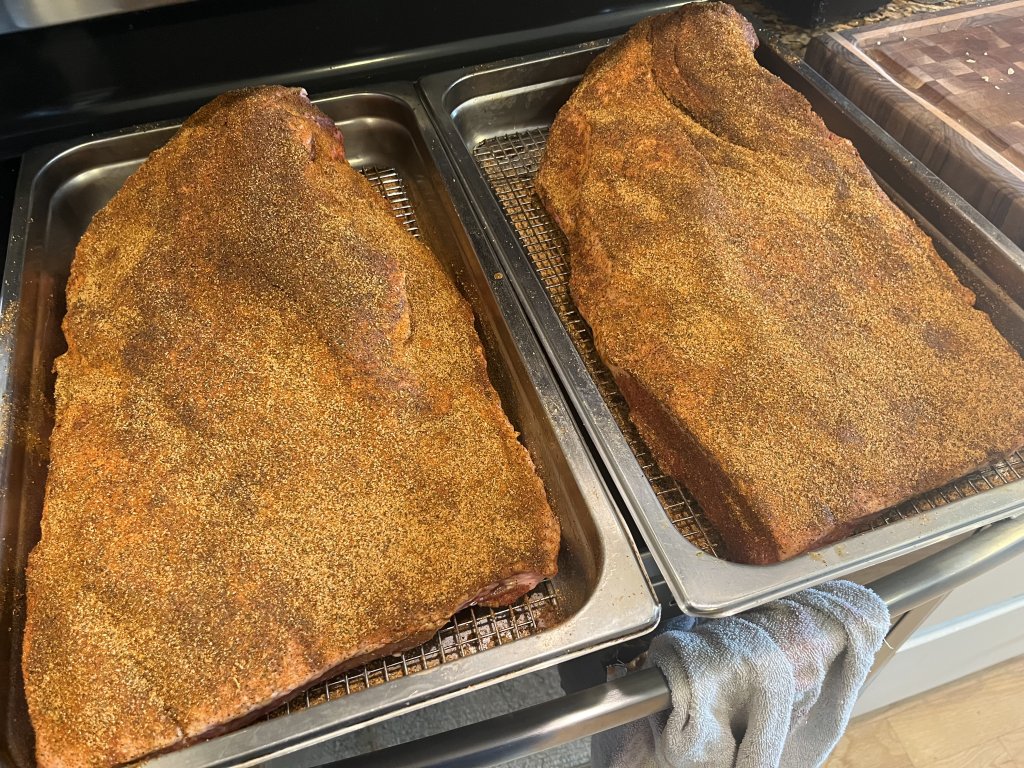 2 prime briskets from Costco going on the Shirley Fabrication offset momentarily (plenty of trimmings for my canine companions). I injected them with Butcher BBQ solution yesterday and then trimmed and coated generously with Oakridge BBQ Black Ops this morning. Sadly, Oakridge shut down in December so I had to stock up on the rub which. am told has a shelf life of 2 years.