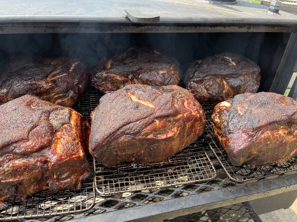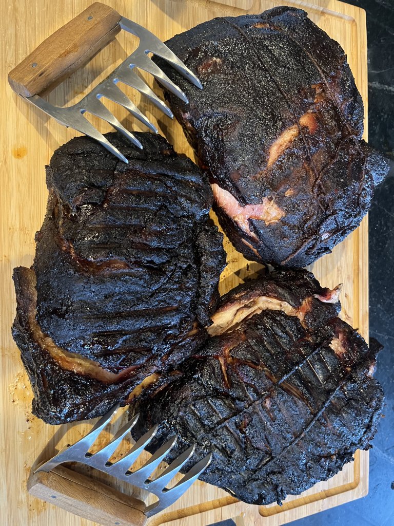 They will go on the smoker at around 300 degrees for ABOUT 2 hours until they have the color I am looking for, then get wrapped in butcher paper and stay on at that same temp for another 4 to 5 hours until they hit the target temp/doneness.