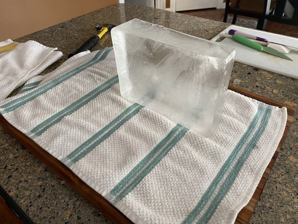 Less time than you'd imagine with the proper tools. Just a small cooler, serrated knife, hammer and 24 hours of patience.