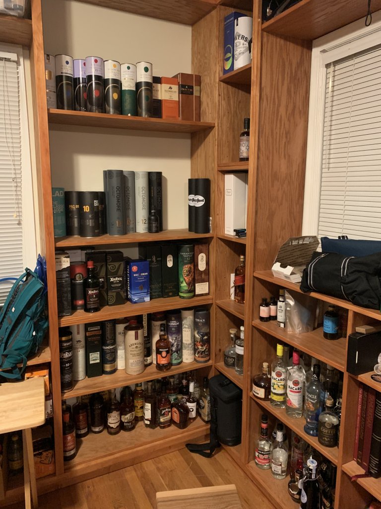 Right narrow top is Ireland overflow, then Bruichladdich overflow, then Compass Box, then 'other blends(mostly JW)', then Gin and Tequila and bottom is storage for sample bottles and extra tall wine carrying bag.