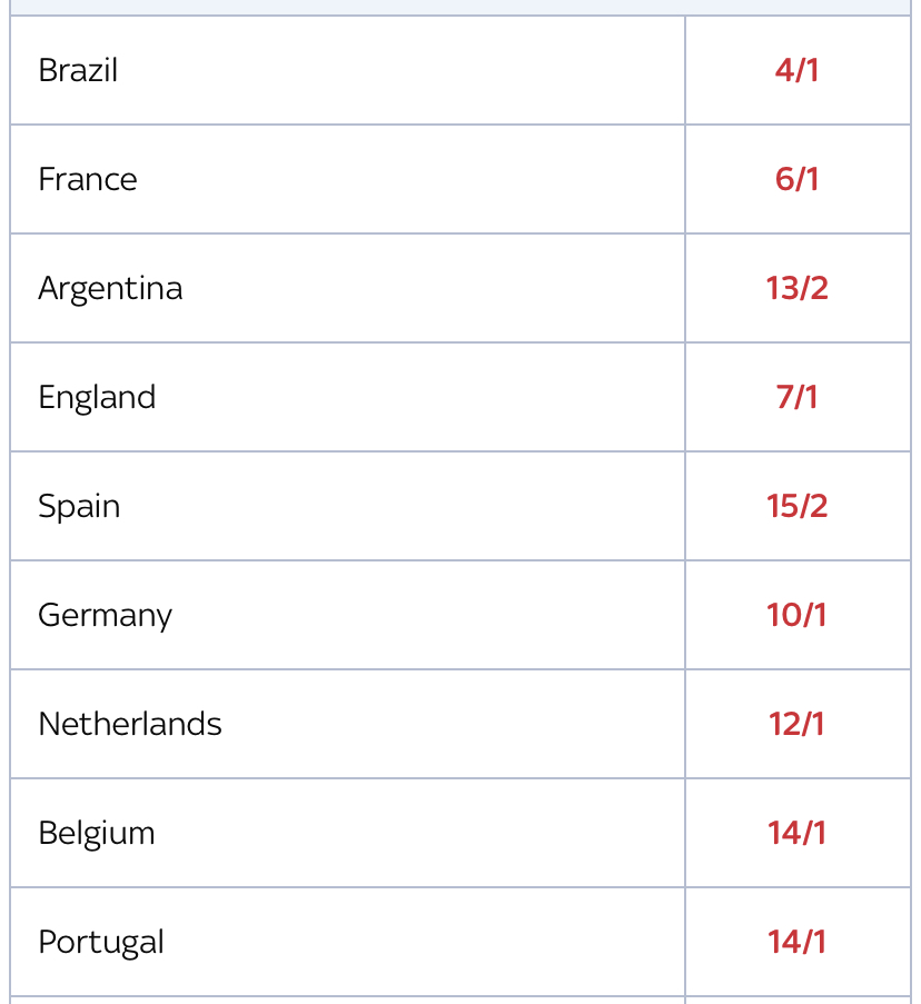 Brazil as the safe bet — imagine having so much talent to choose from that you don't even have Martinelli or Jesus in your squad for Qatar. It's there's to lose.
