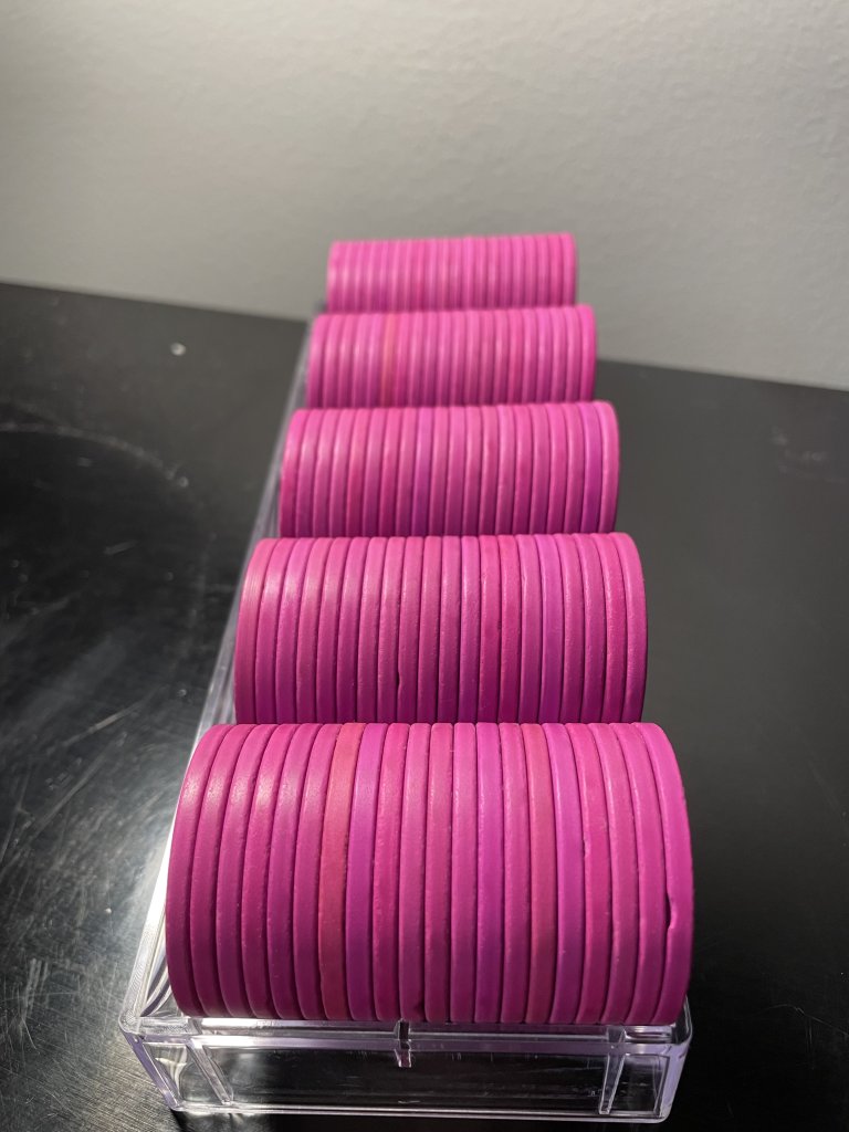 My chips hadn't seen a brush or oil for ages as I don't use them so much. I did your technic. In the process of drying. After the first 48h when you stack them in 10 I made a slight change. I stack them in 20 in the middle of a rack and apply a second coating that way. I can pressure the chips very well and slightly rotated the all 20 in a move. I have one rack dedicated for that. In a similar fashion when I have cleaned them up, I finish with stacks of 20 in the middle of a rack and then brush intensively just the edges. Works magic.