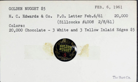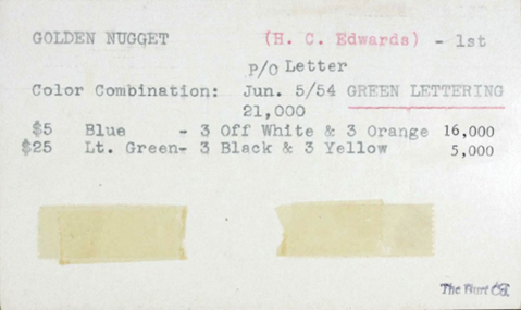 This is the timeline as far as I understand it. H. C. Edwards first ordered the chips from the Burt Co. for the Golden Nugget. Below are the order cards for the first 1954 order, and a later 1961 re-order, courtesy of the ChipGuide.