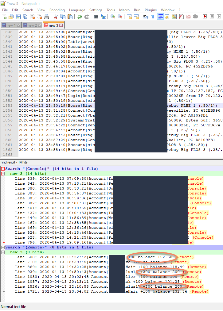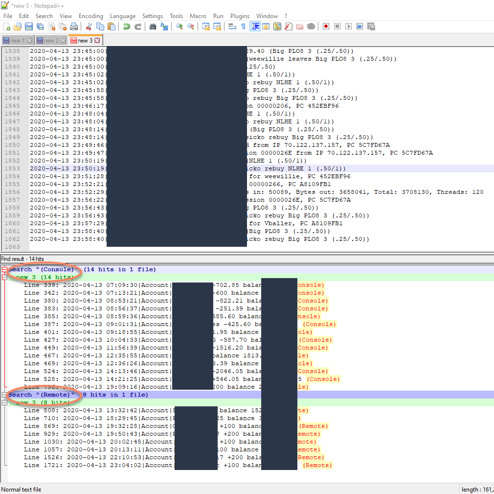 I find all in current document (ctrl-F) for both the words (Remote) and (Console)- this brings up a very clean view as to what chips went into what account. I cross reference this to my google sheet and highlight all verified payments.