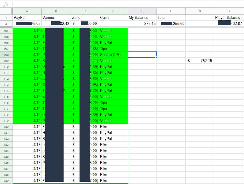 I keep a running spreadsheet in Google sheets. Every transaction I log - most real time, and the rest each morning as part of my audit process. I keep a running tab of my balances from each account and use some math to ensure my balance keeps updated as well as my own profit or loss - currently down a few hundo. I subtract tips to the house as it's own line item, as well as any fees taken from the Elks Lodge. We hold two nights a week where we rake or charge a fee to pay out of work bar staff.