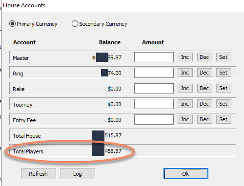 Here it does not - because there is currently a ring game going, so there is money on the table not accounted for in the total player balance. I just add that together (74+58.87 =x32.87) and it matches. Bank is right. Now I log all balances to the log, so tomorrow if there are errors I can spot them immediately.